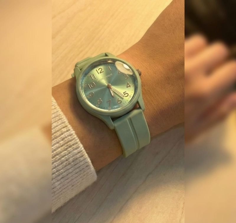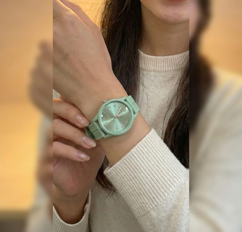 This timepiece blends contemporary minimalism with a soft, nature-inspired aesthetic. Featuring a matte sage green silicone strap and case, it offers a seamless, unified look that feels both lightweight and durable.