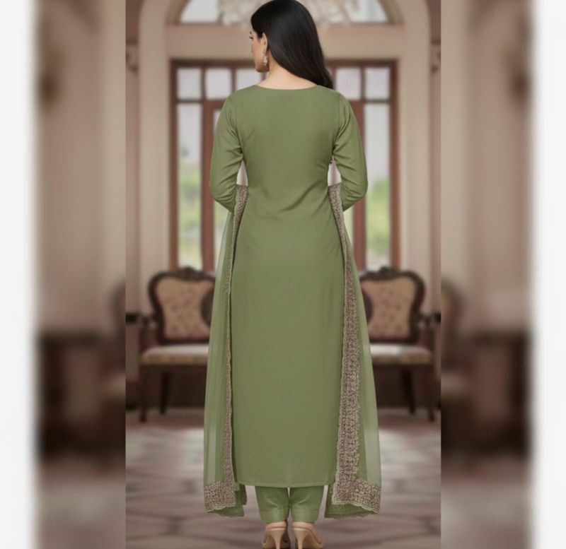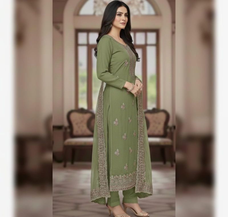 beautiful, unstitched Salwar Kameez suit piece in a refreshing shade of sage green (also often called pistachio or light olive). It’s a classic choice for ethnic wear that balances elegance with a modern color palette.