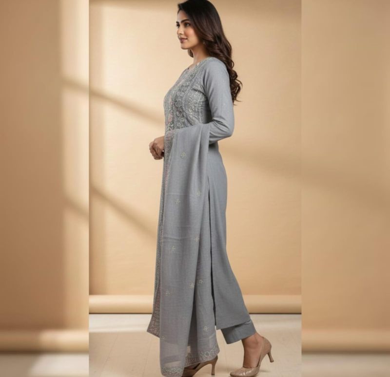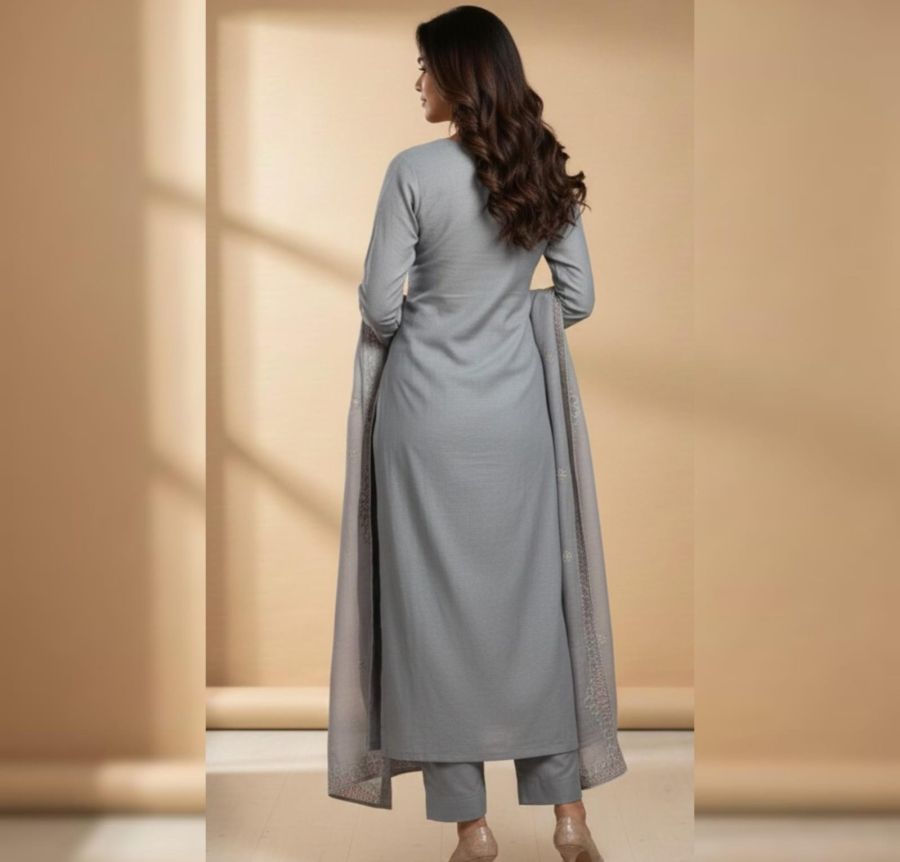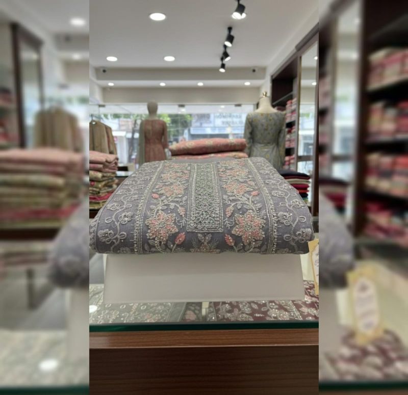 The intricate embroidery and that muted lavender-grey tone make for a very sophisticated, elegant look. It looks like a high-quality unstitched suit set, likely destined to be a standout salwar kameez or anarkali.