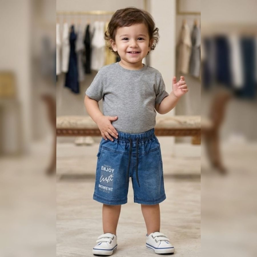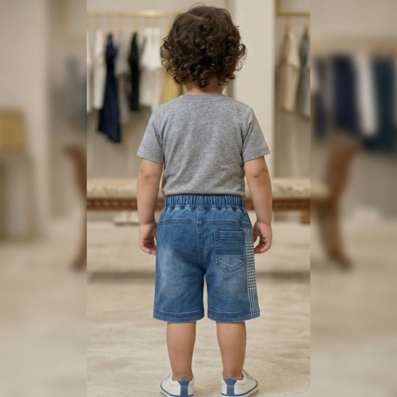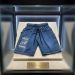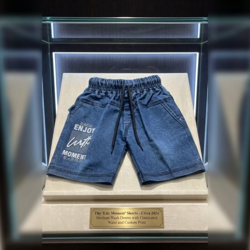 That’s a pretty humorous take on modern fashion or perhaps a satirical look at "fast fashion" history. Seeing a pair of elastic-waist denim shorts behind a museum-style glass case with a brass plaque is a clever commentary on how we might view 2020s-era casual wear in the future.
