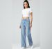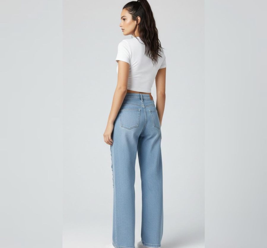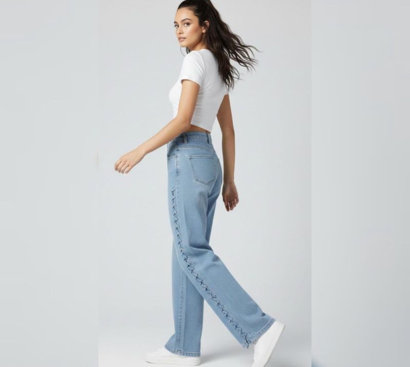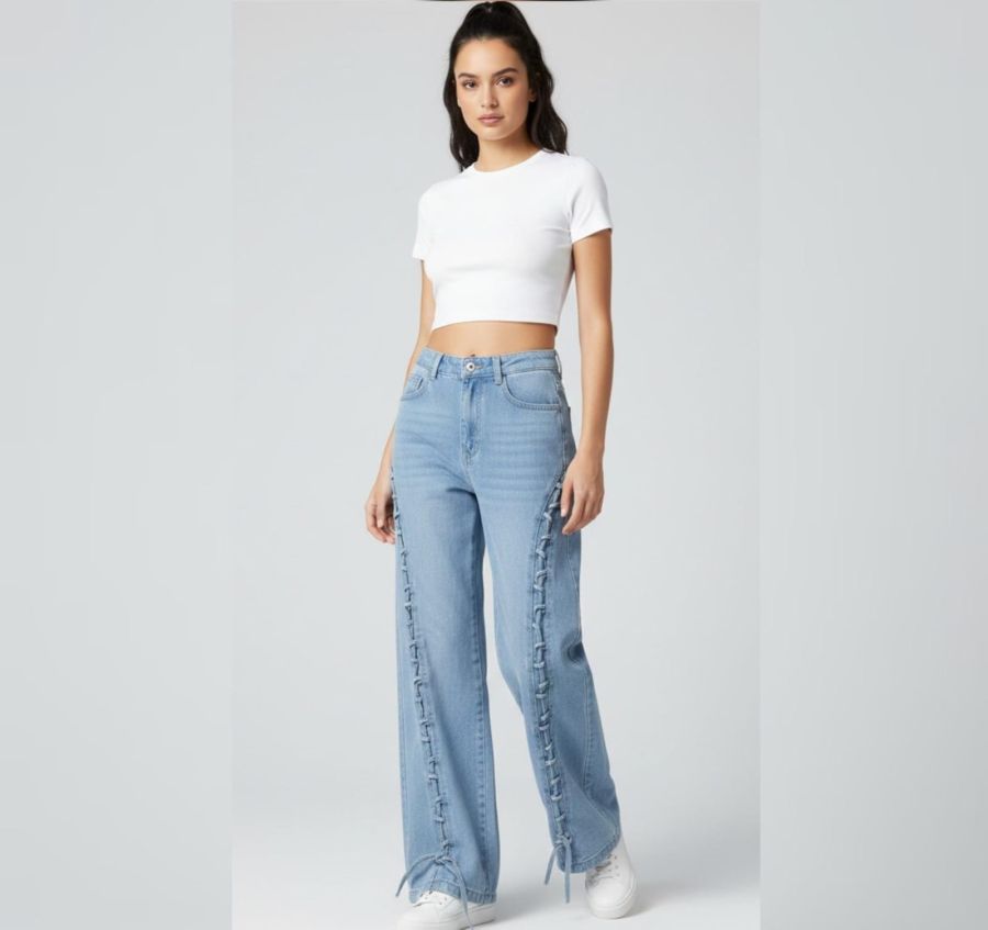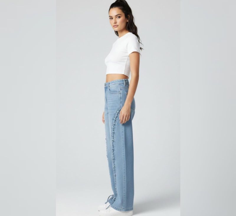 These light-wash blue jeans are designed with a high-waisted fit and a relaxed, wide-leg cut. The standout feature is the intricate vertical lace-up detailing that runs down the entire length of both outer side seams. Finished with delicate bows at the ankles, these jeans offer a creative twist on classic denim, perfect for pairing with cropped tops and sneakers.
