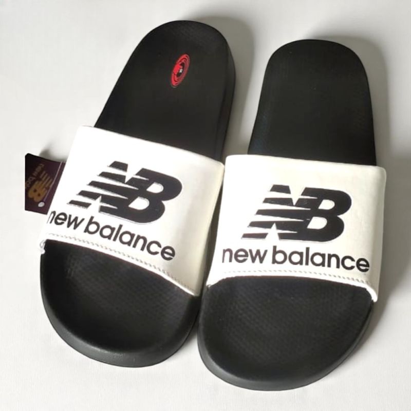 This is a New Balance slide slippers are sleek, casual footwear designed for comfort and style. Featuring a black, textured sole for enhanced grip, they ensure stability on various surfaces. The wide white strap displays the iconic "NB" logo and "new balance" text in bold black, offering a sporty aesthetic. These slippers are lightweight, making them ideal for everyday wear, whether at home or on the go. The open-toe design provides breathability, perfect for warm weather. Key Feature: Textured sole for superior grip, ensuring stability and comfort during casual use.