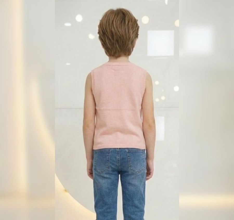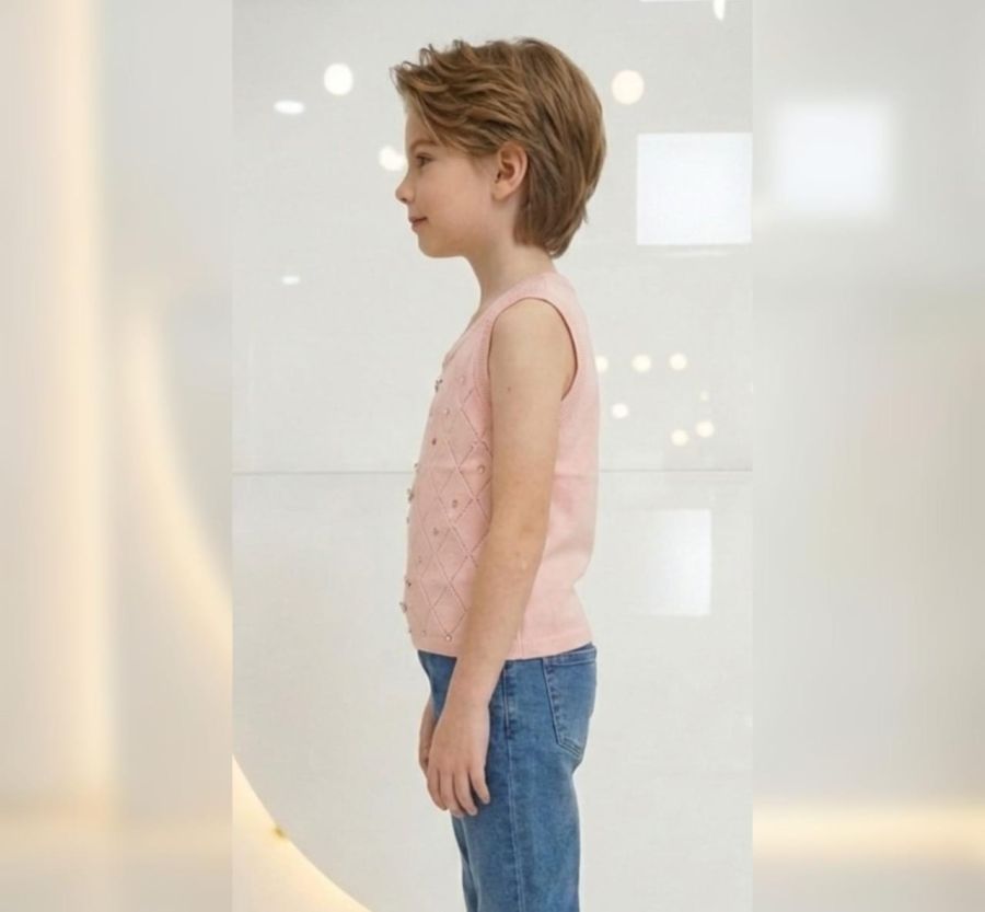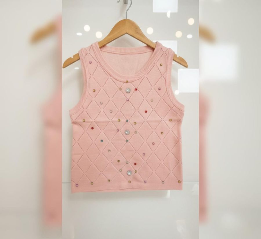 This pastel pink sleeveless top features a sophisticated pointelle knit in a classic diamond (argyle) pattern. To add a touch of magic, the front is embellished with multi-colored crystals and rhinestones scattered across the knit. It is designed with a comfortable ribbed round neckline and hem, perfect for layering over a long-sleeve shirt or wearing on its own during warmer days.