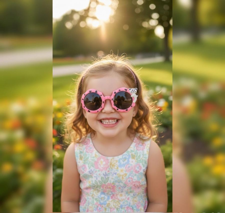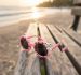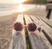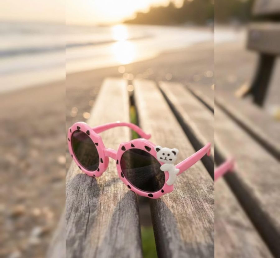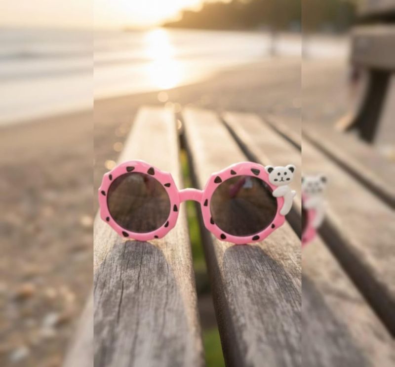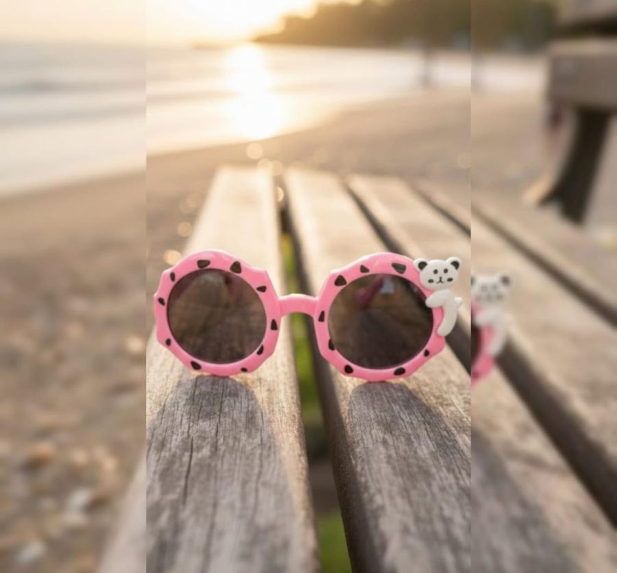 That is a great shot! The warm sunset glow and the wooden textures of the bench create a very cozy, summer-vacation vibe. Those pink panda sunglasses are definitely the star of the show.