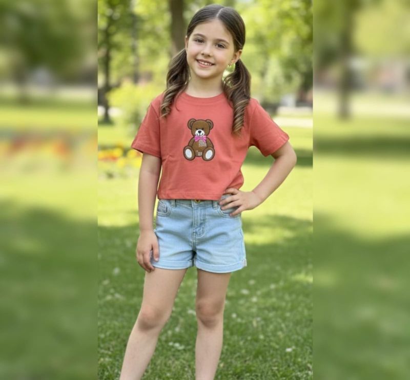 Features a central teddy bear patch with a pink bow detail and patchwork accents.