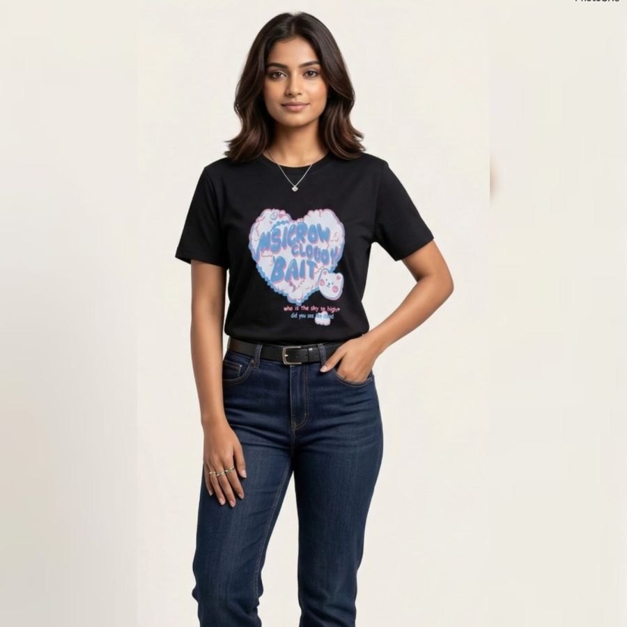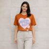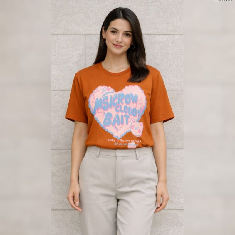 A stylish, regular-fit crew neck T-shirt in a rich Rust/Terracotta hue. The center features a high-quality puff-print style graphic of a heart-shaped cloud, incorporating whimsical typography and a cute character accent. This piece is designed for those who love a mix of streetwear vibes and soft, aesthetic art.
