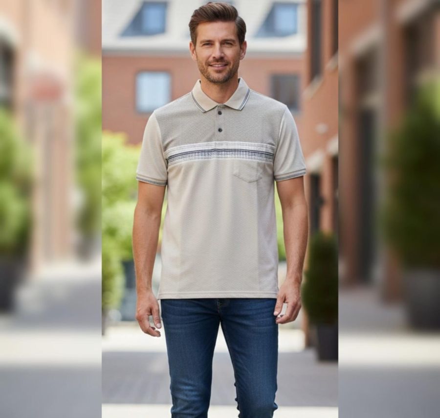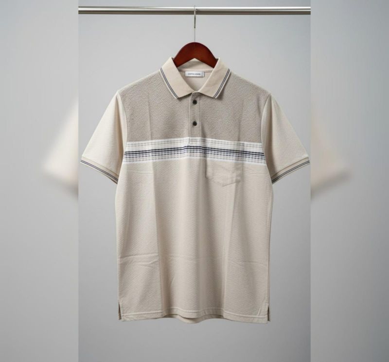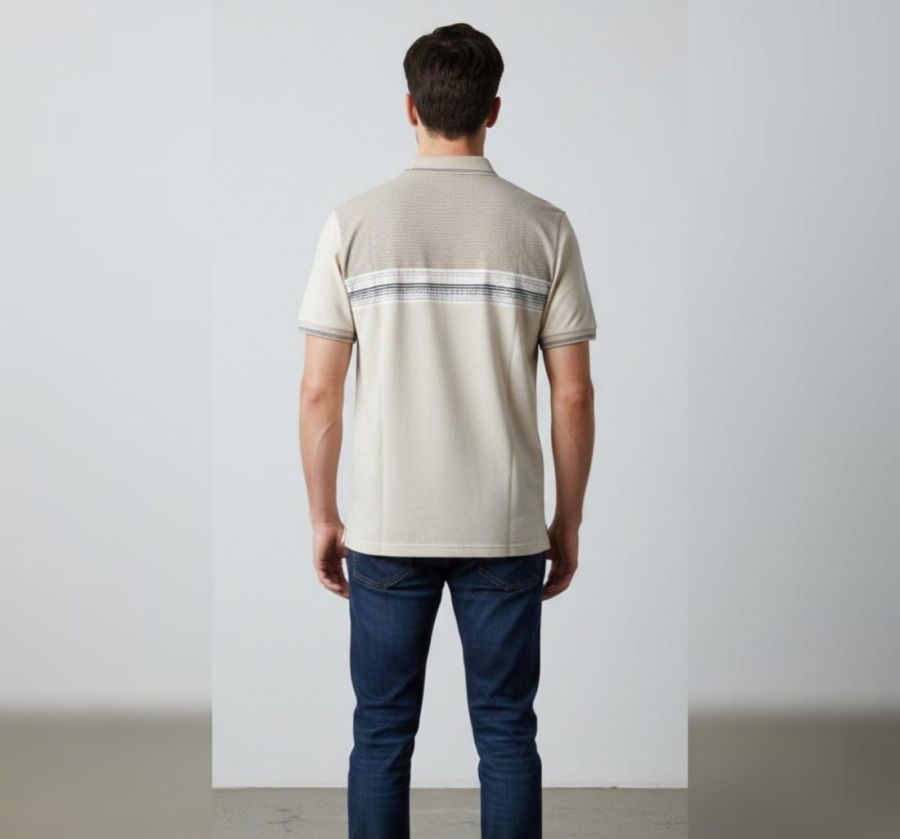 A sophisticated smart-casual essential, this polo features a refined Beige and Ivory color palette. The garment is uniquely constructed with a dual-texture knit: a micro-diamond weave on the upper chest and a smooth,