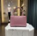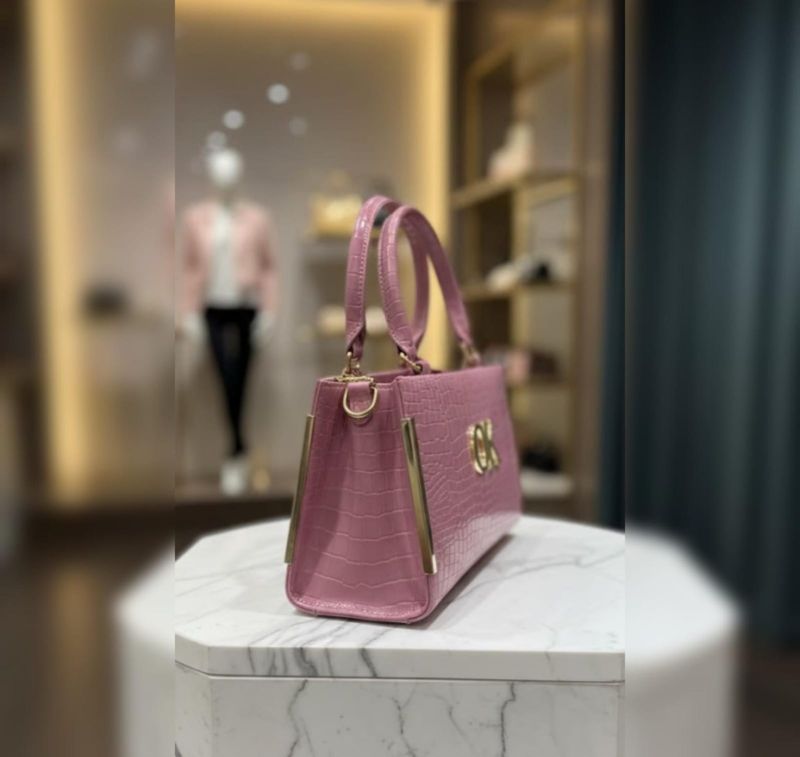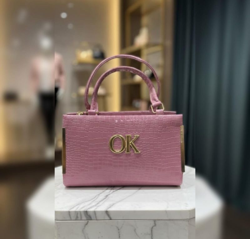 ColorA vibrant, dusty mauve-pink.MaterialEmbossed leather (or high-quality faux leather) with a croc-effect (crocodile skin) pattern.ShapeRectangular and boxy with sharp, defined edges for a formal look.HardwarePolished gold-tone metal, including the central "OK" logo and vertical bars on the side edges.HandlesDual rounded top handles in matching croc-embossed material.