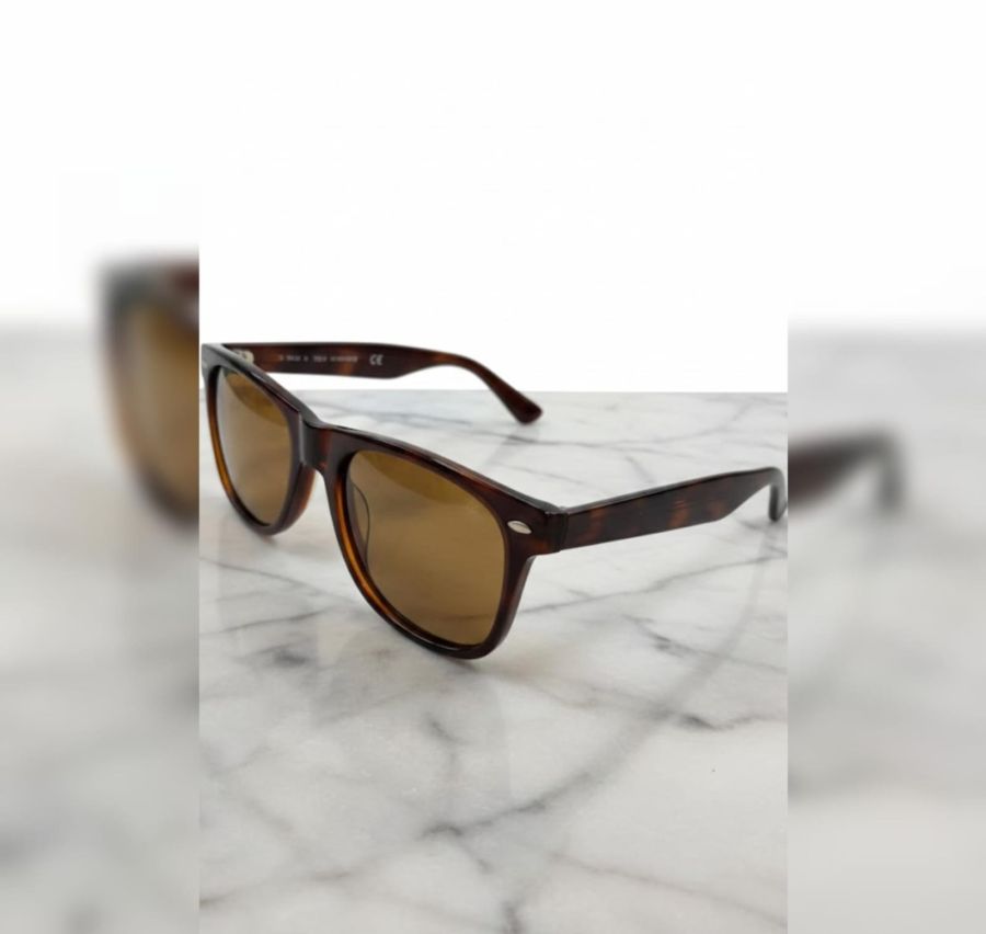 These are a pair of classic, tortoise-shell sunglasses featuring a timeless wayfarer-inspired silhouette.