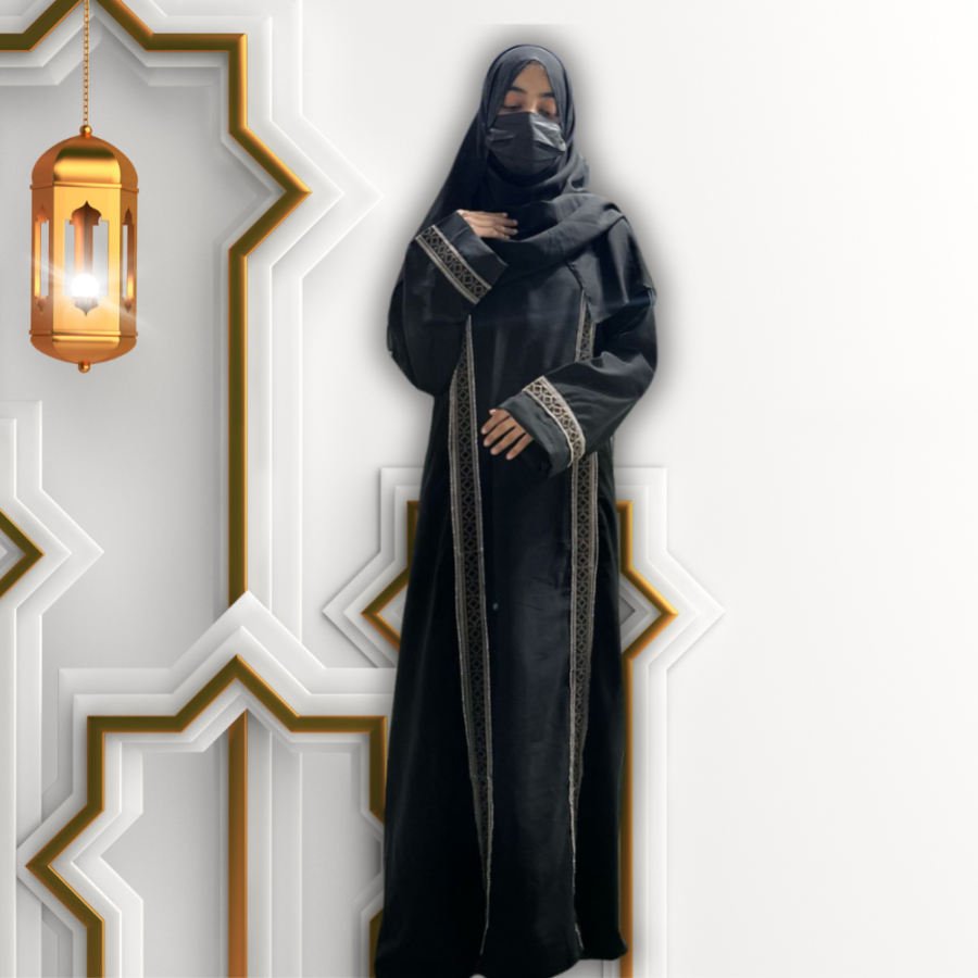 This elegant black abaya is designed for modern modest wear, blending traditional aesthetics.