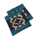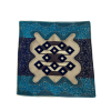 An Elegant cushion cover made of polyester fabric with a cream center, blue border, and intricate dark geometric patterns.