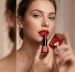The image features a matte bullet lipstick with a matching outer cap, presented on a clean, white minimalist pedestal. The overall aesthetic is bold and modern, characterized by a monochromatic red theme.