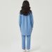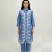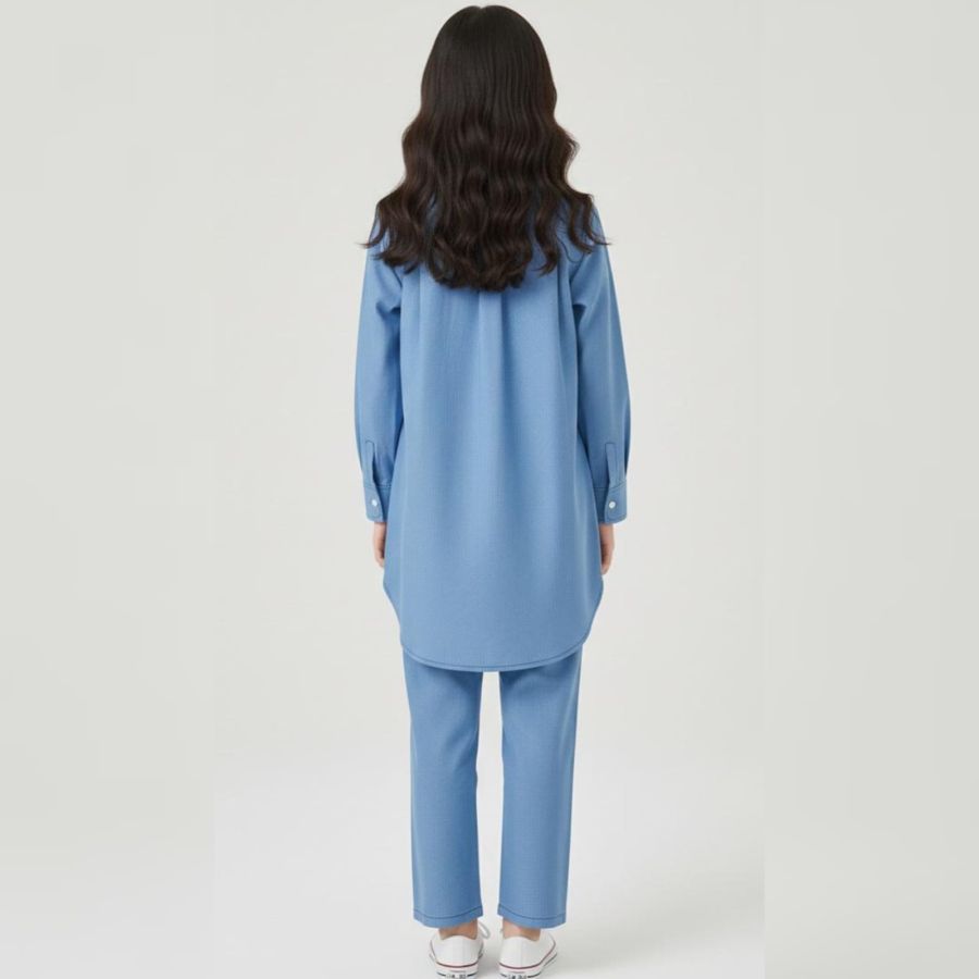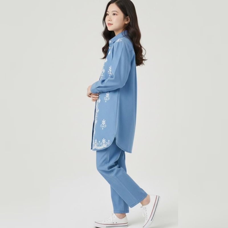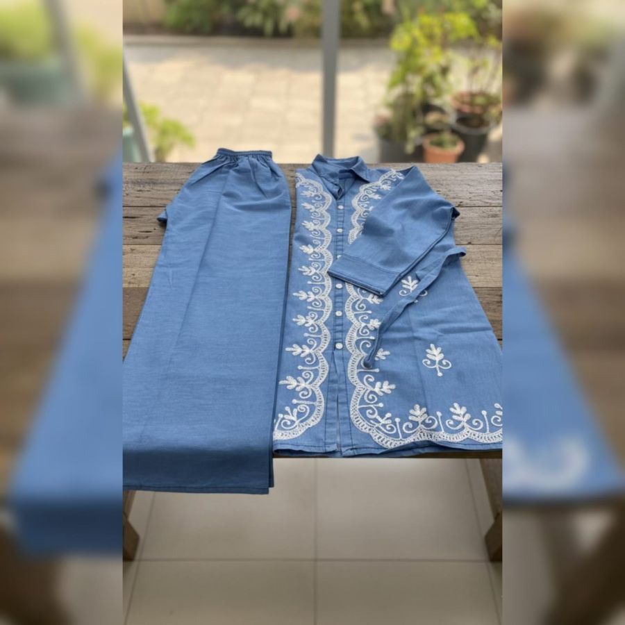 his outfit is a sophisticated blend of traditional ethnic silhouettes and modern denim-inspired aesthetics. It features a long-line tunic (kurta style) paired with matching straight-leg trousers