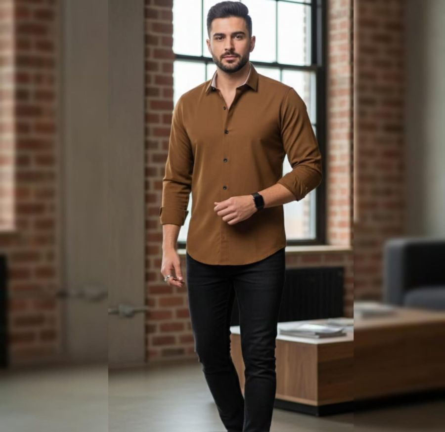 The rich, Tobacco Brown (Cedar) hue provides a sophisticated alternative to traditional blues and whites, pairing effortlessly with dark denim or charcoal chinos. Featuring a classic pointed collar, adjustable button cuffs, and matte onyx buttons, it’s designed for the man who values both comfort and a sharp silhouette.