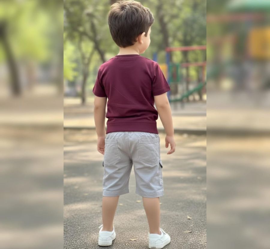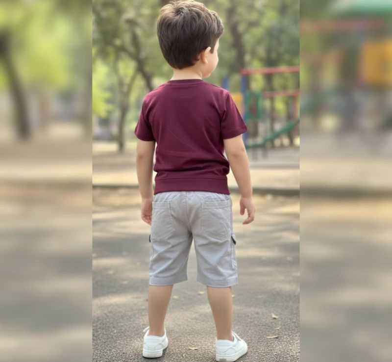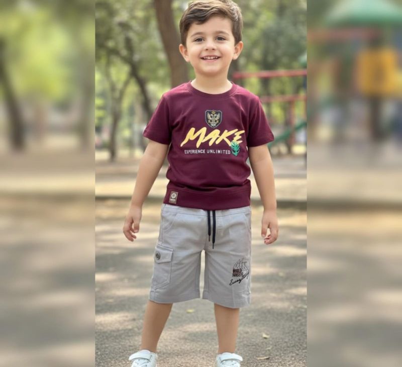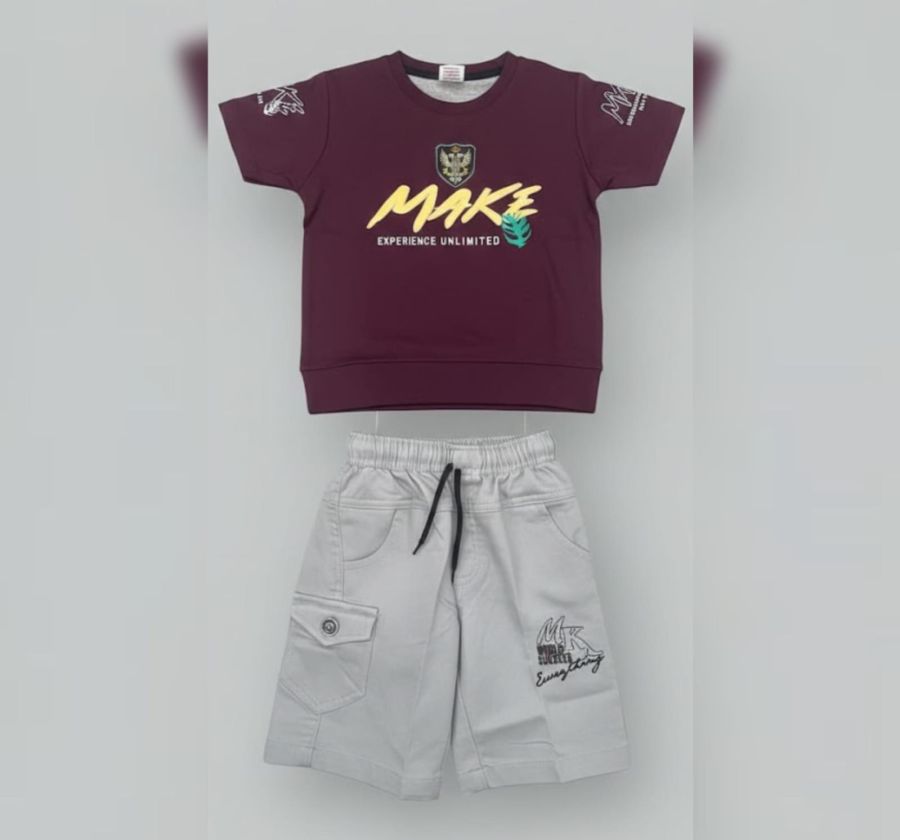 Inject some energy into your child's wardrobe with this premium coordinated short set. The outfit features a rich Burgundy (Maroon) crew-neck t-shirt detailed with striking "MAKE" typography in high-contrast yellow and high-quality graphic emblems on the chest and sleeves.