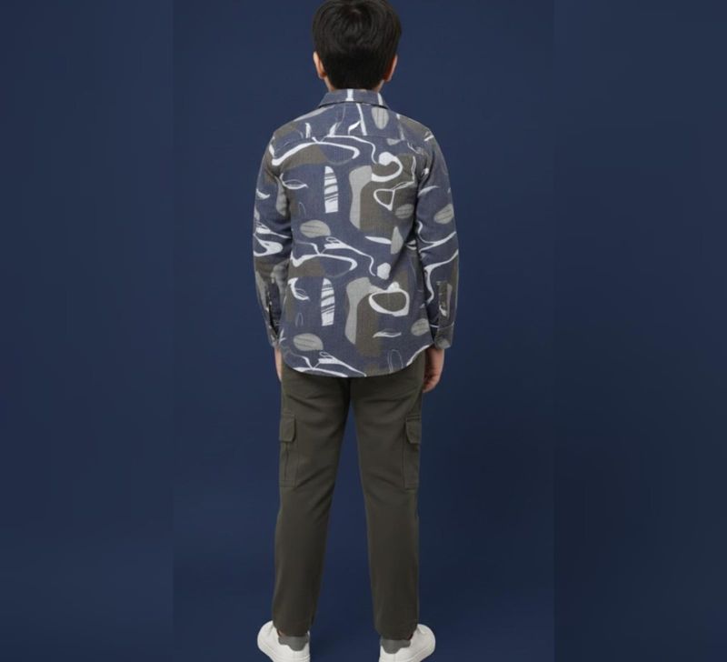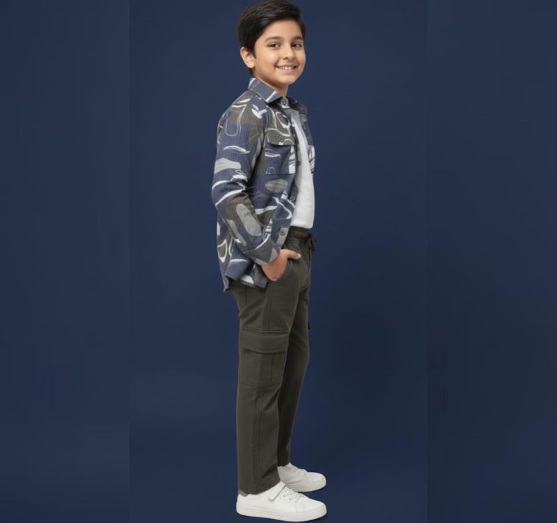 Elevate his wardrobe with this premium three-piece utility ensemble. The set features a stylish Navy & Charcoal Camo-patterned overshirt with a structured collar and functional twin chest pockets. It is layered over a crisp, soft White crew-neck inner tee for a clean contrast.
