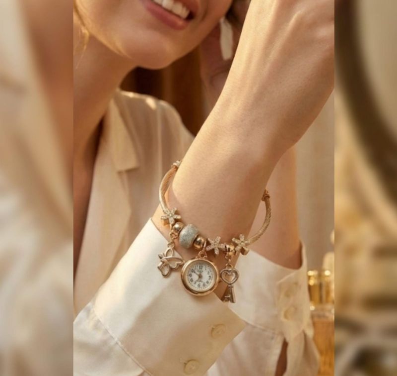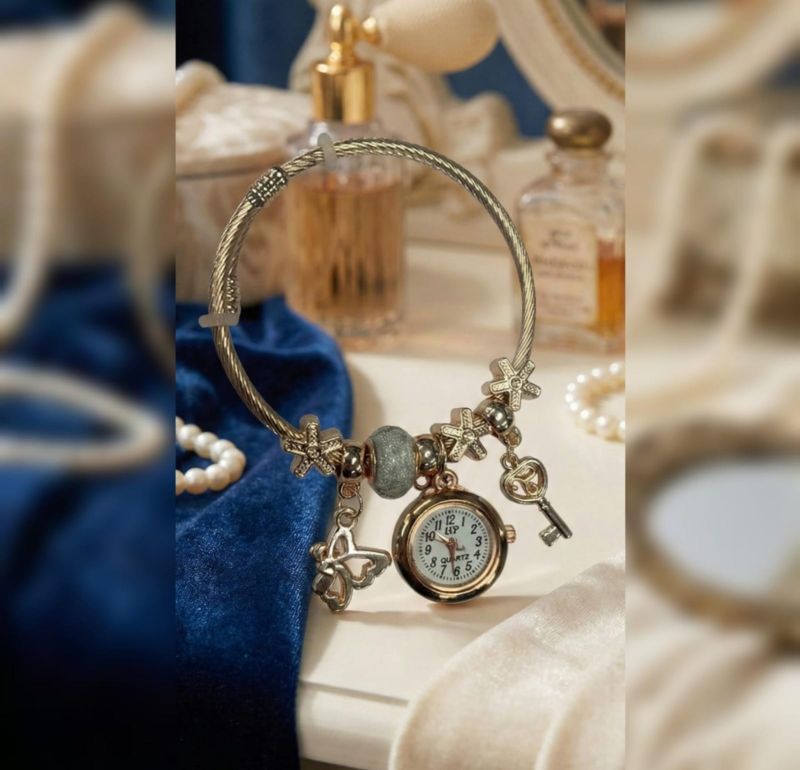 Gemini said This piece is a beautiful blend of jewelry and utility—a vintage-inspired charm bracelet watch. It has a very "shabby chic" or Victorian aesthetic that feels much more like an accessory than a traditional timepiece.