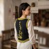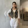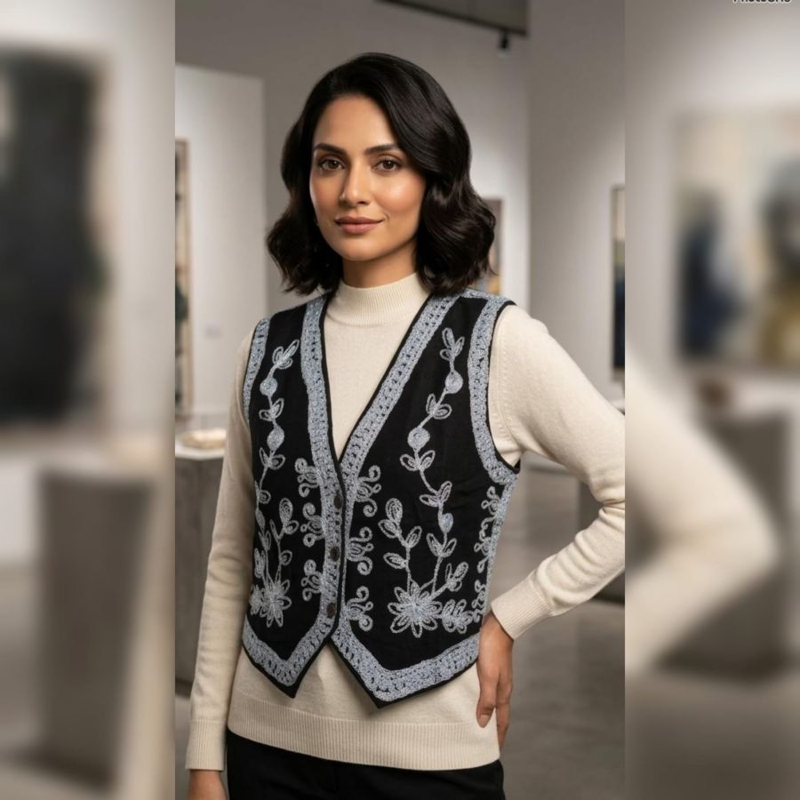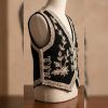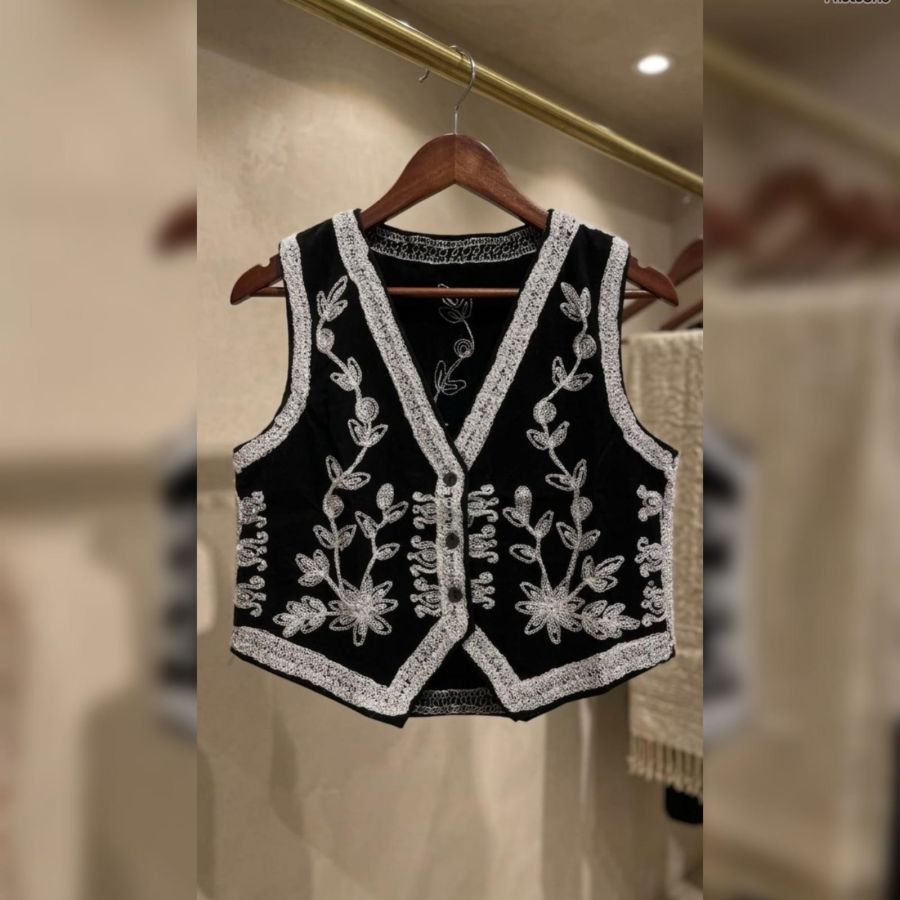 An exquisite ethnic waistcoat (Koti) crafted from premium black velvet. It features intricate silver pinstripe-style Zari embroidery with delicate floral and vine motifs. This sleeveless jacket is designed to be layered over shirts, tunics, or kurtas to instantly elevate a casual look into a festive or semi-formal ensemble.