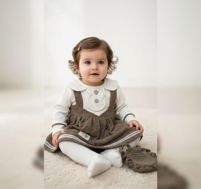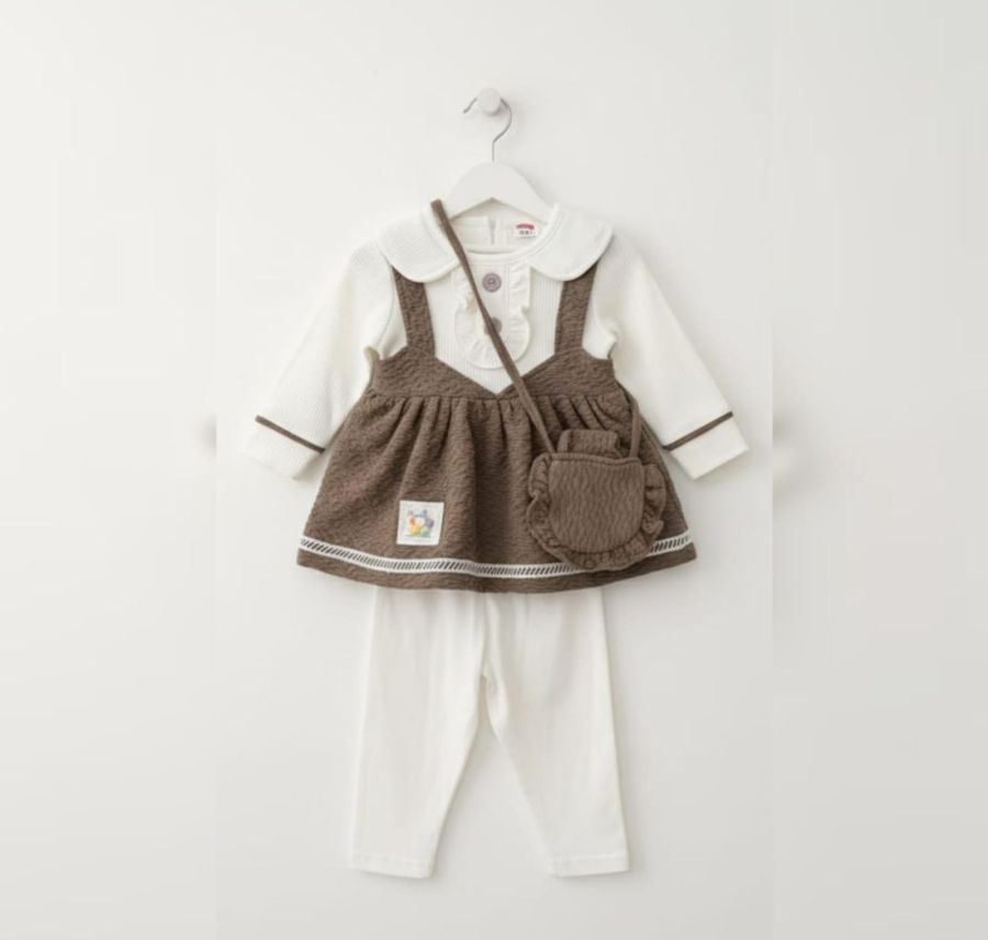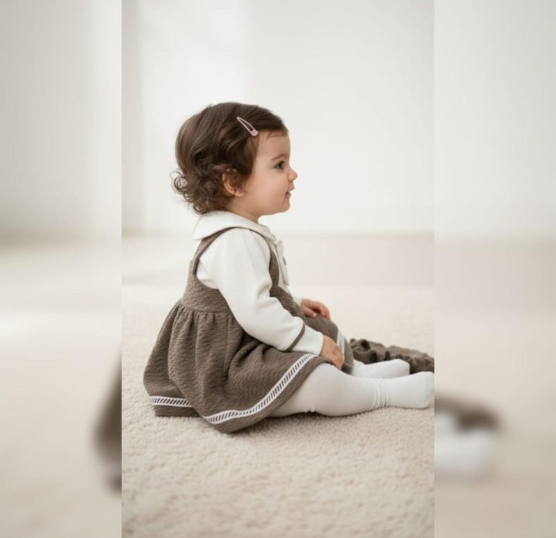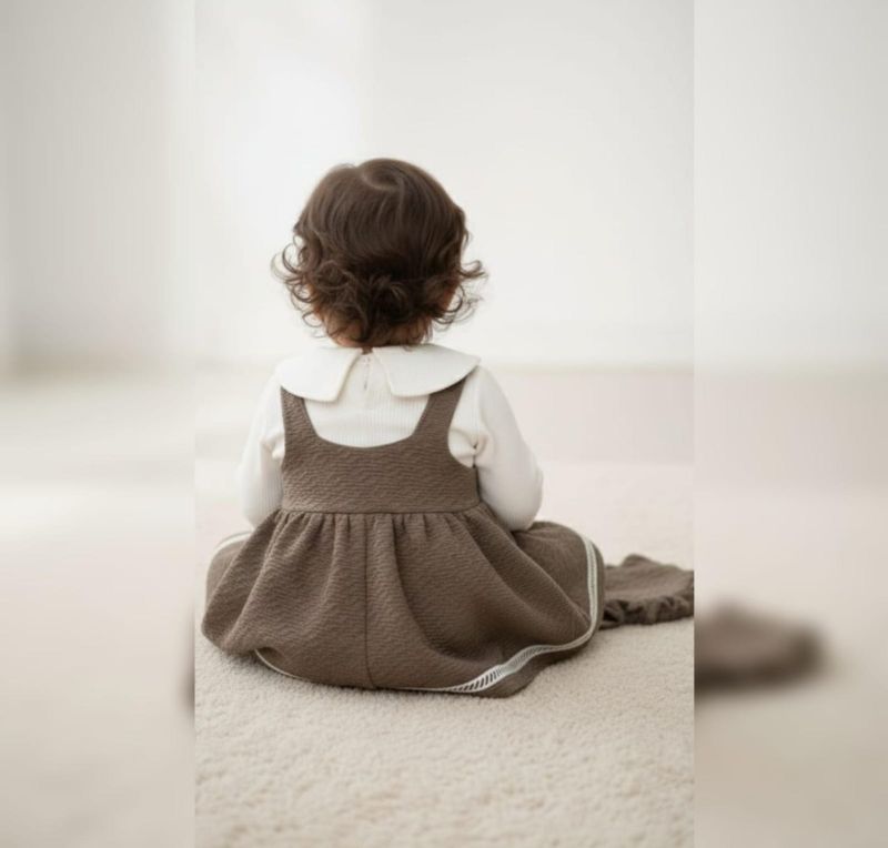 This elegant two-piece ensemble features a textured, ruffled pinafore dress in a rich walnut brown, paired with a soft cream-colored long-sleeve bodysuit. The bodysuit is highlighted by a delicate Peter Pan collar and ruffle detailing on the chest, creating a timeless, sophisticated look.