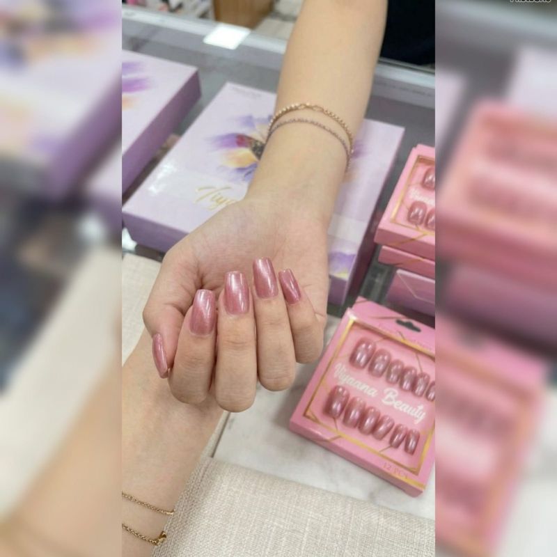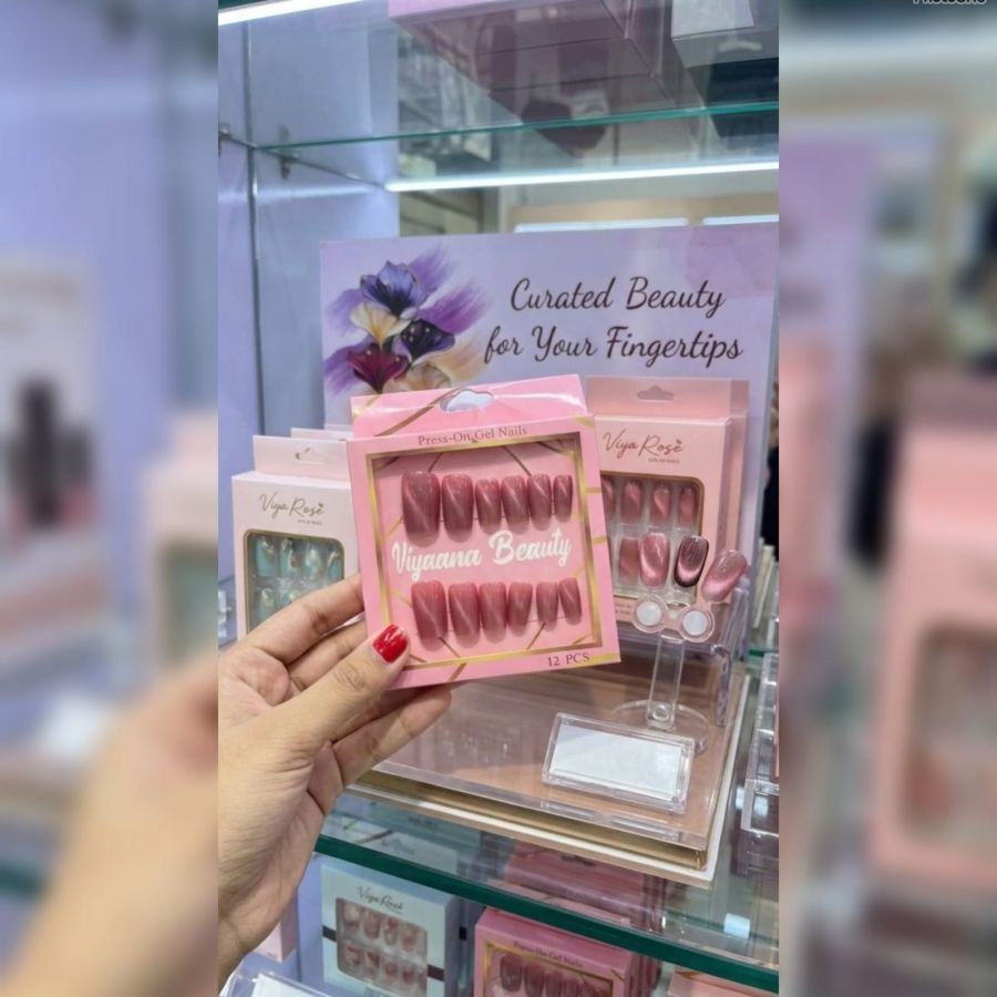 Those are some sharp-looking nails! It looks like you've found a set of Viyaana Beauty Press-On Gel Nails. The specific style in your hand features a "cat-eye" or magnetic velvet finish, which gives that cool dimensional shimmer.