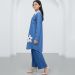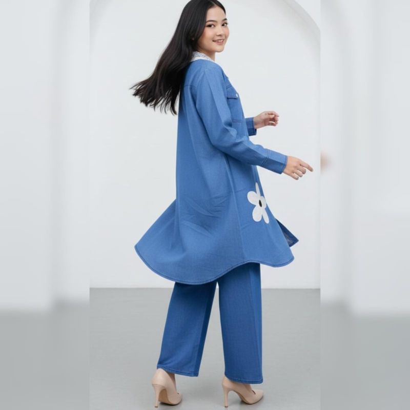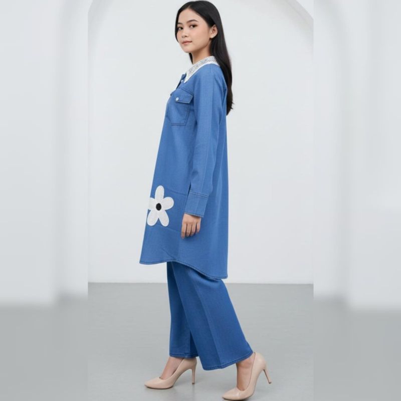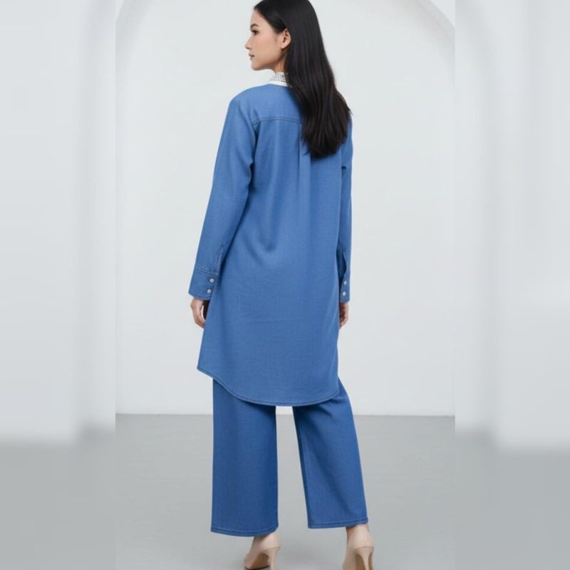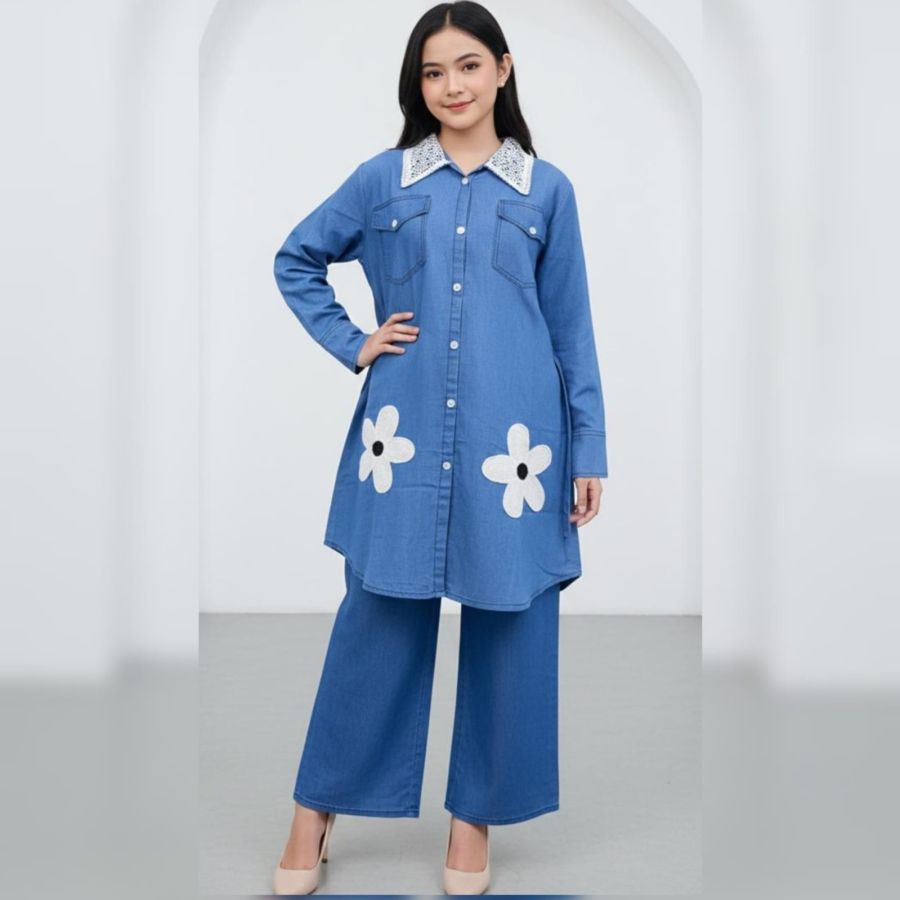 This image features a stylish and modest two-piece denim set, perfect for a casual yet feminine look. It combines the ruggedness of denim with delicate decorative elements.