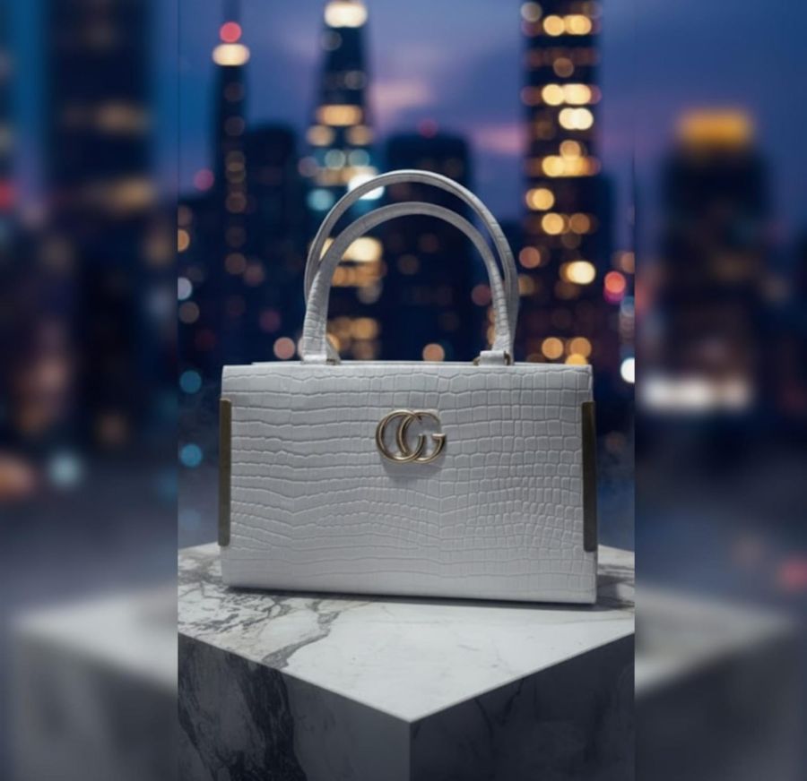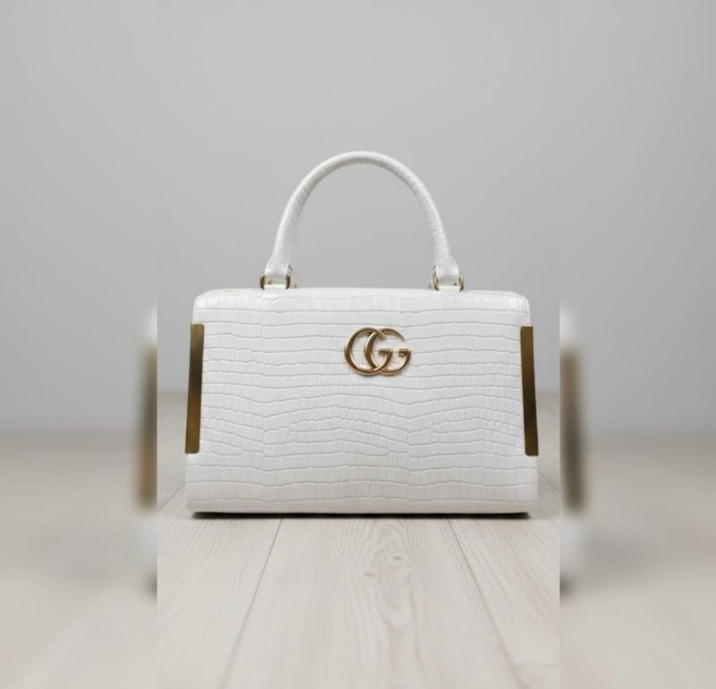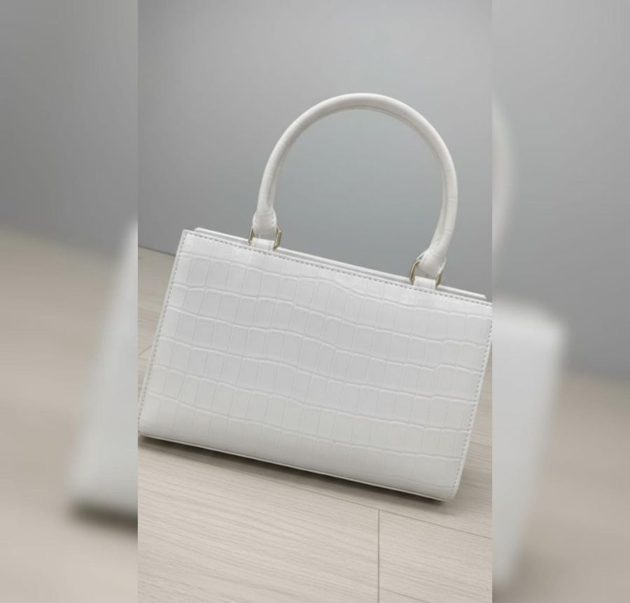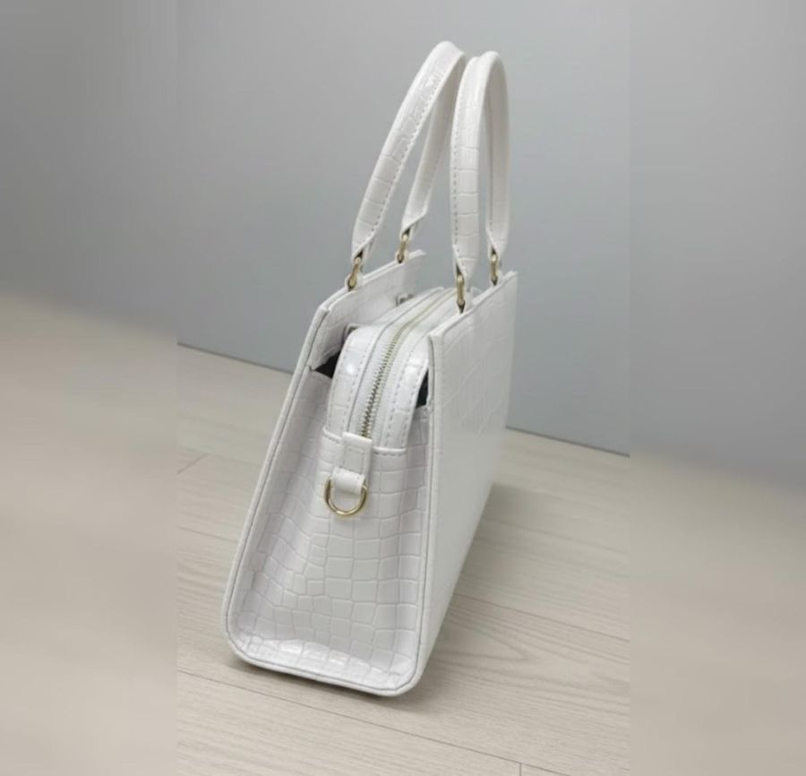 top-handle bag, specifically one featuring a white croc-embossed leather finish and gold-toned hardware.