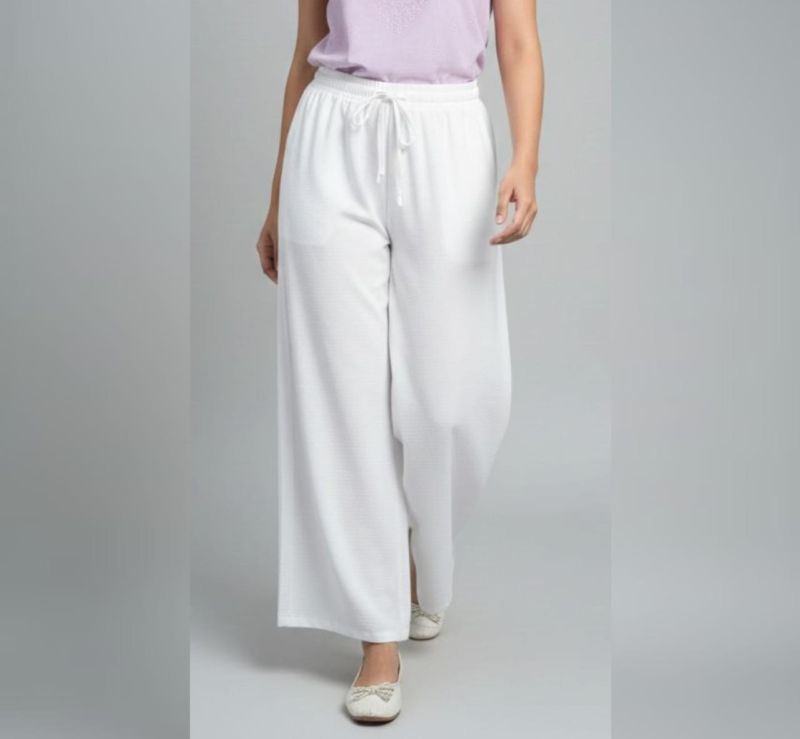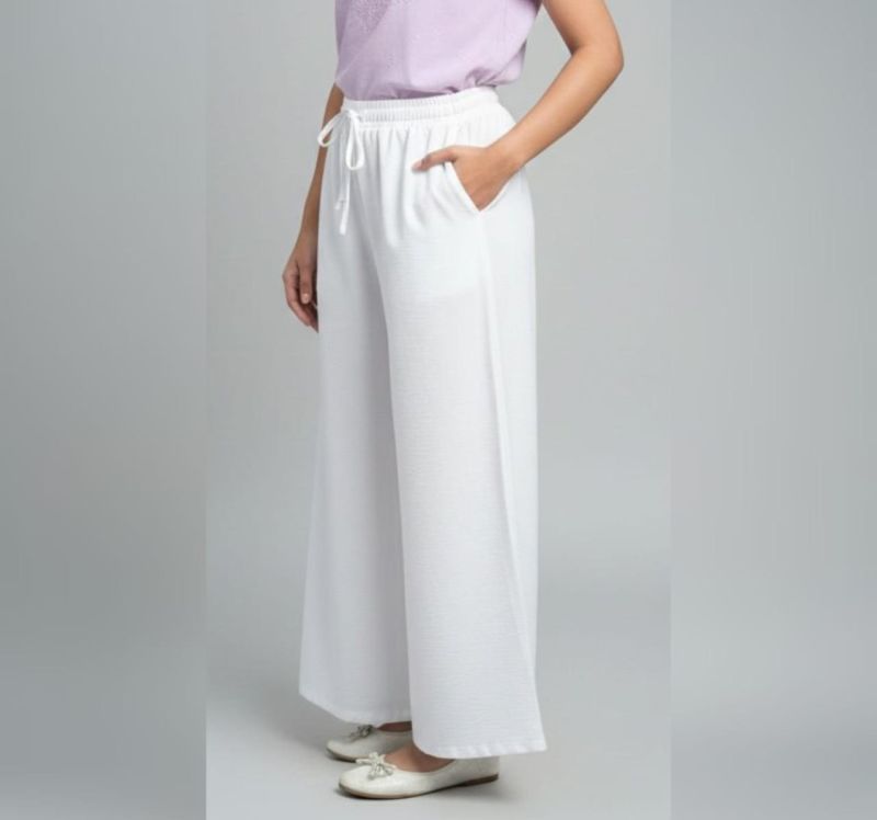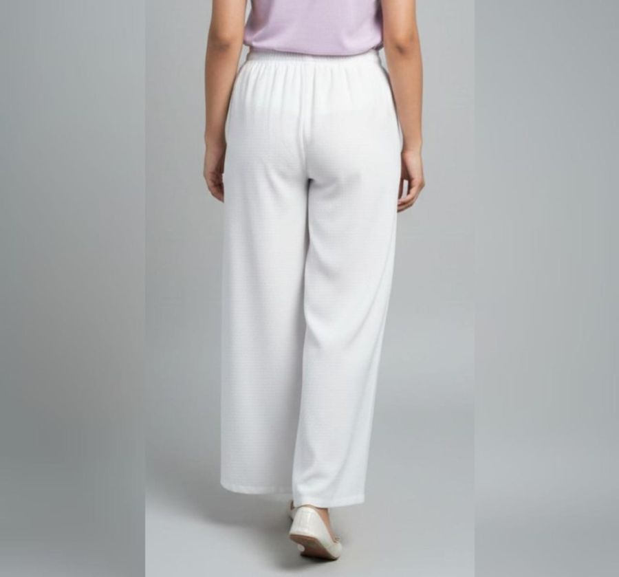 Color & Fabric: The trousers are a crisp solid white. They appear to be made from a lightweight, textured fabric—likely a cotton-linen blend or a soft crepe—ideal for casual or lounge wear.