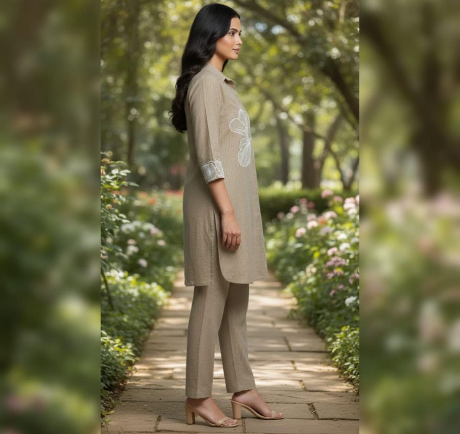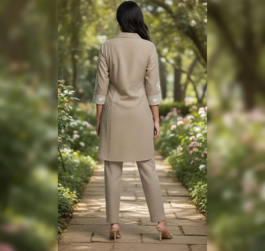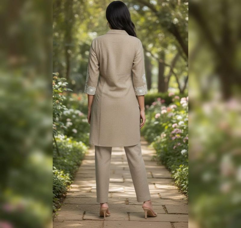 Elevate your everyday wardrobe with this chic Floral Embroidered Co-ord Set. Crafted from high-quality textured fabric, this set features a beautifully detailed floral design that adds feminine charm to a modern silhouette. The breathable material and relaxed fit make it perfect for office wear, casual lunches, or semi-formal gatherings.