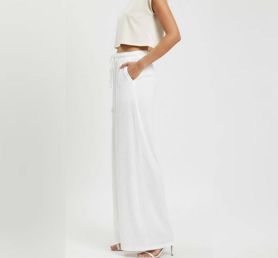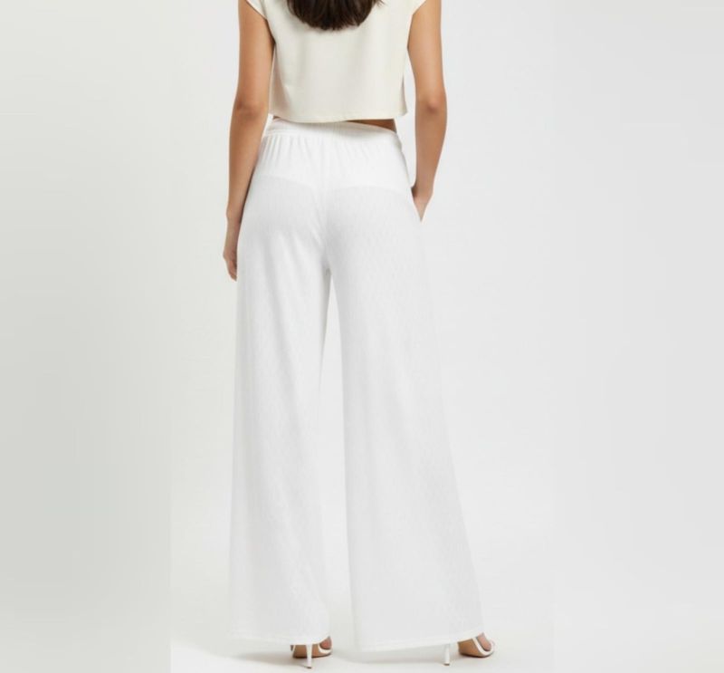 Elevate your everyday comfort with these elegant wide-leg palazzo pants. Designed with a flexible high-rise waistband and adjustable drawstring, these lowers offer a flattering, relaxed fit for all body types. The breathable, textured fabric ensures maximum airflow, making them an ideal choice for casual outings, beach vacations, or stylish lounging. Pair them with a crop top or a tucked-in tee for a modern, minimalist look.