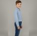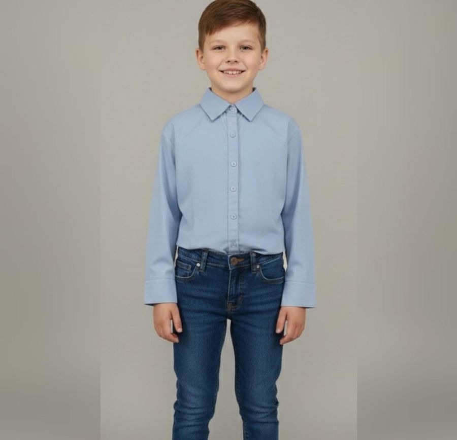 This looks like a classic light blue, long-sleeved button-down shirt designed for children
