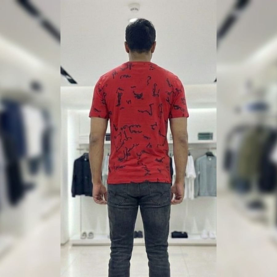This is a Jordan Brand graphic T-shirt designed with a bold, urban aesthetic. It features a vibrant red base color contrasted by an intricate, black abstract doodle pattern printed across the front, back, and sleeves.