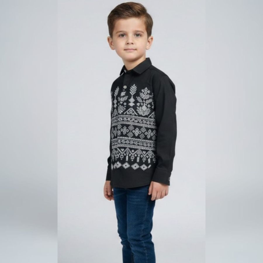 The shirt in the image you shared is a stylish black button-down featuring a white geometric or tribal-inspired pattern. It’s a great example of a contemporary "Indo-Western" or ethnic print shirt that balances tradition with a modern, casual fit.