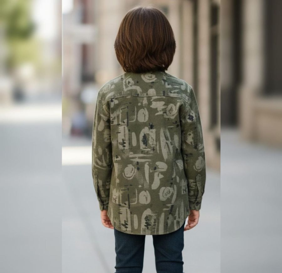 That's a bold piece! It looks like a long-sleeved, button-down shirt with a heavy utilitarian or streetwear vibe. The olive drab/khaki base mixed with that abstract, almost "digital-glitch" camo pattern gives it a very rugged, modern look.