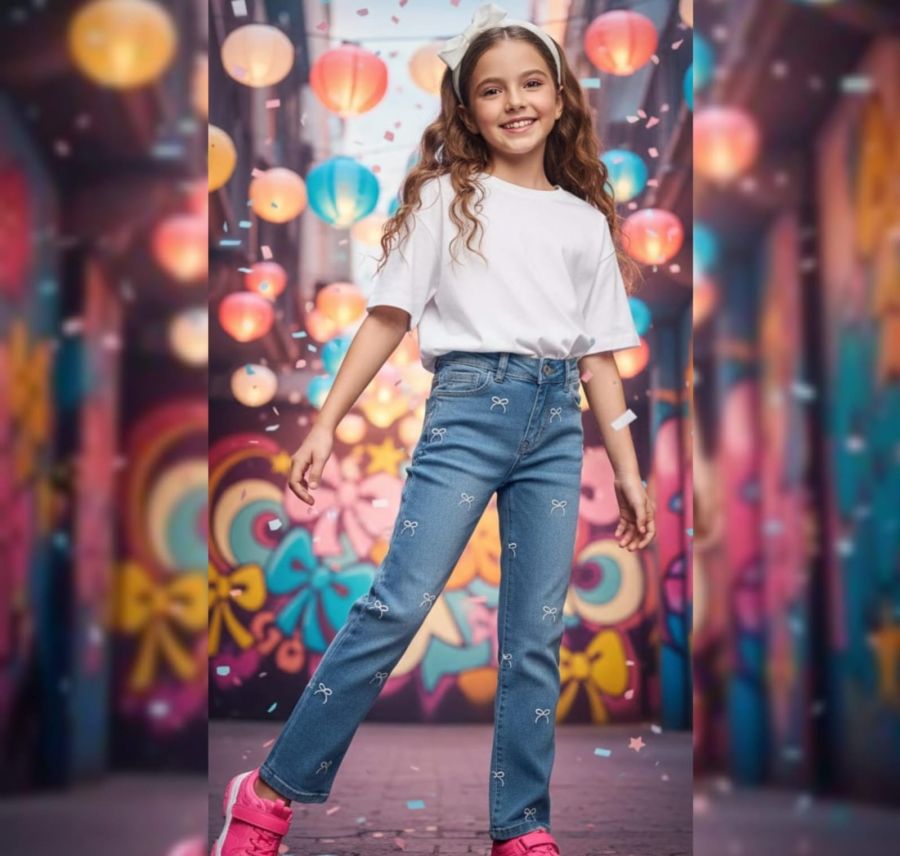 These light-wash blue jeans are designed with a high-waisted, straight-leg silhouette that offers both comfort and a modern aesthetic. The standout feature is the all-over white bow print, which is delicately scattered across the front and back of the garment. Crafted from durable, high-quality denim, these pants are a versatile choice that can be easily paired with basic tees or stylish blouses.