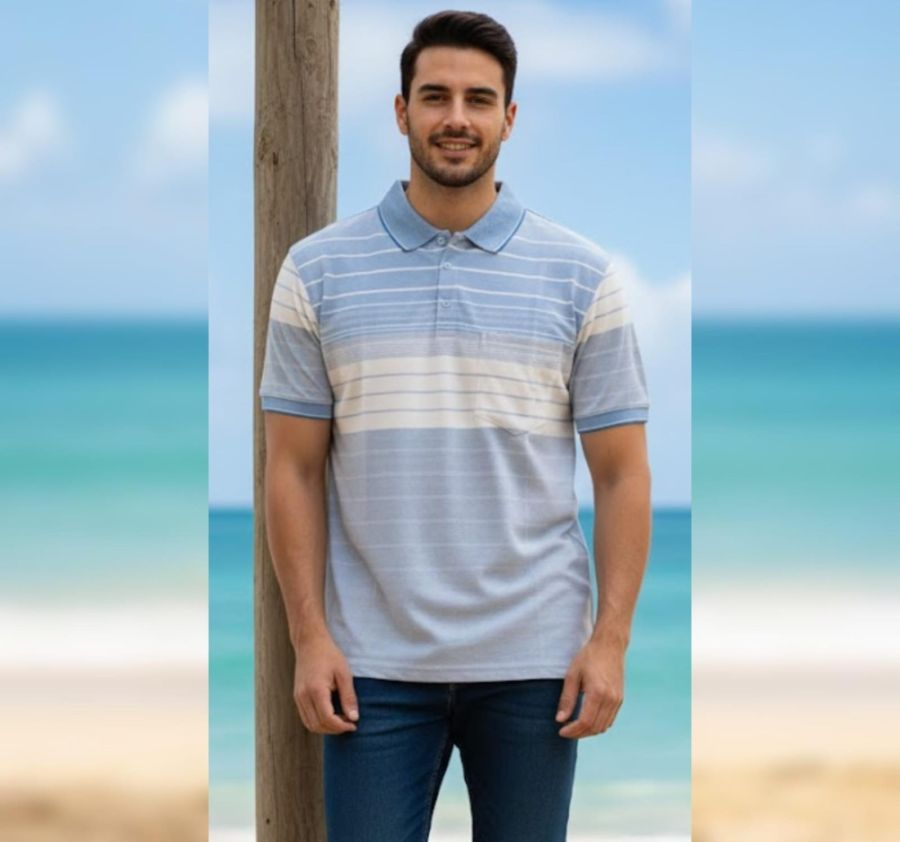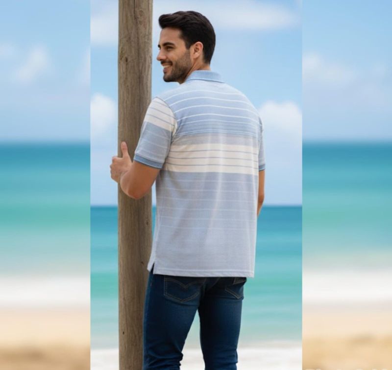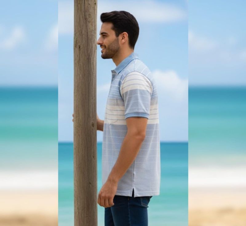 The Azure Breeze Striped Polo is a masterclass in relaxed elegance. Featuring a calming palette of sky blue, crisp white, and subtle grey, this shirt utilizes a gradient stripe pattern to create a modern, structured aesthetic. Designed for maximum comfort without sacrificing style, it is the perfect choice for weekend outings or casual office days.