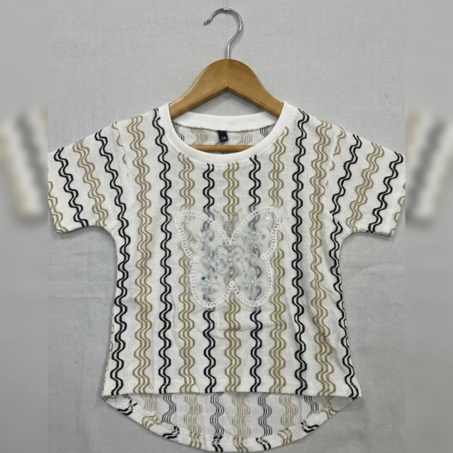 Type: Children's short-sleeved t-shirt. Color Palette: White base color with alternating black and beige/gold vertical wavy stripes.