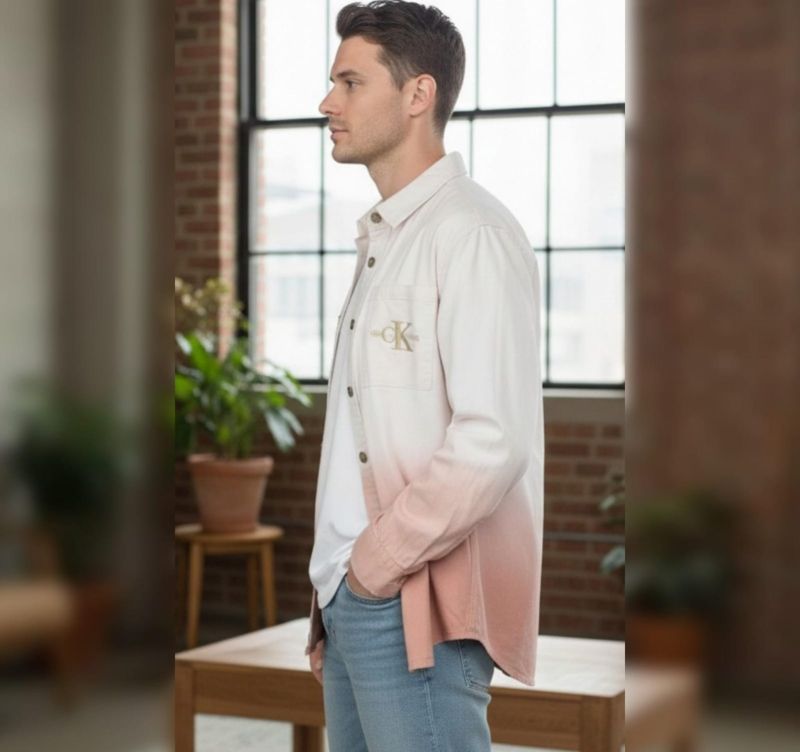 This shirt is a modern, casual long-sleeve button-down featuring a distinct dip-dye ombre design.