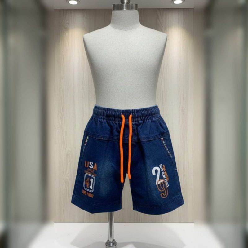 That’s a pair of classic denim shorts with a sporty, energetic vibe! The dark wash paired with those bold orange accents really makes them pop.