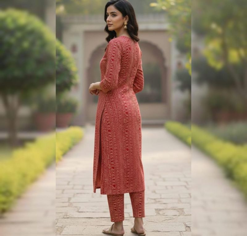 Radiate traditional elegance with this vibrant Ruby Red 3-piece ethnic suit. This set features a straight-cut kurta showcasing classic Bandhani-inspired patterns in a vertical arrangement that creates a tall, slimming silhouette. The ensemble is elevated by a stunning dual-tone ombre dupatta, fading from soft peach to deep red, and is paired with matching printed straight-fit trousers. Perfect for festive celebrations, family gatherings, or casual day outings, this suit offers a timeless look with a contemporary touch.