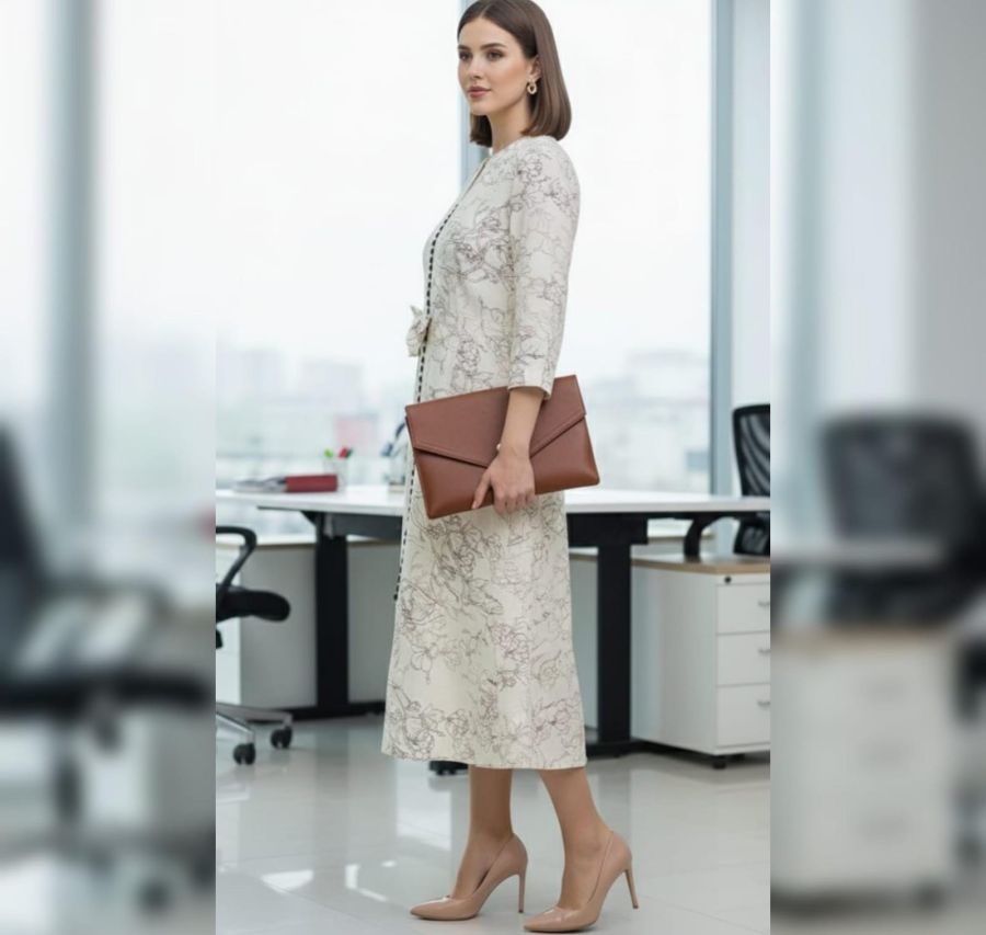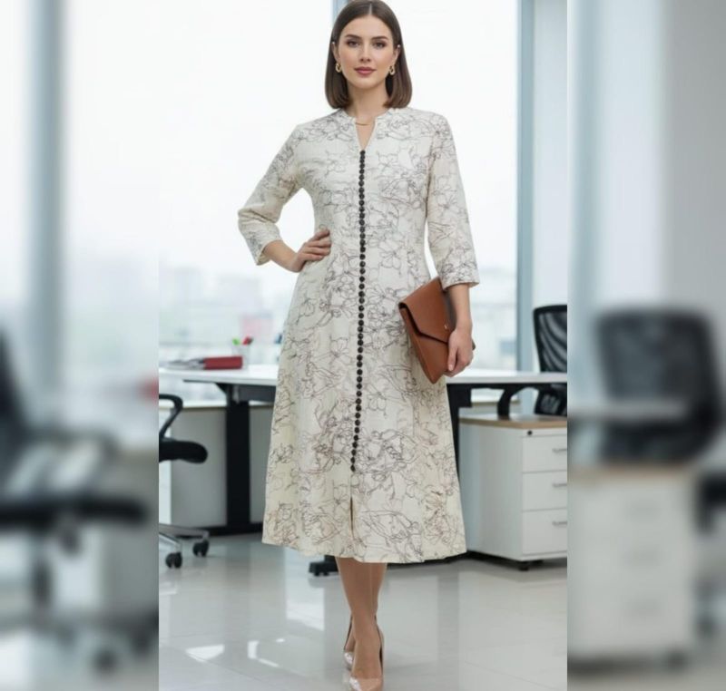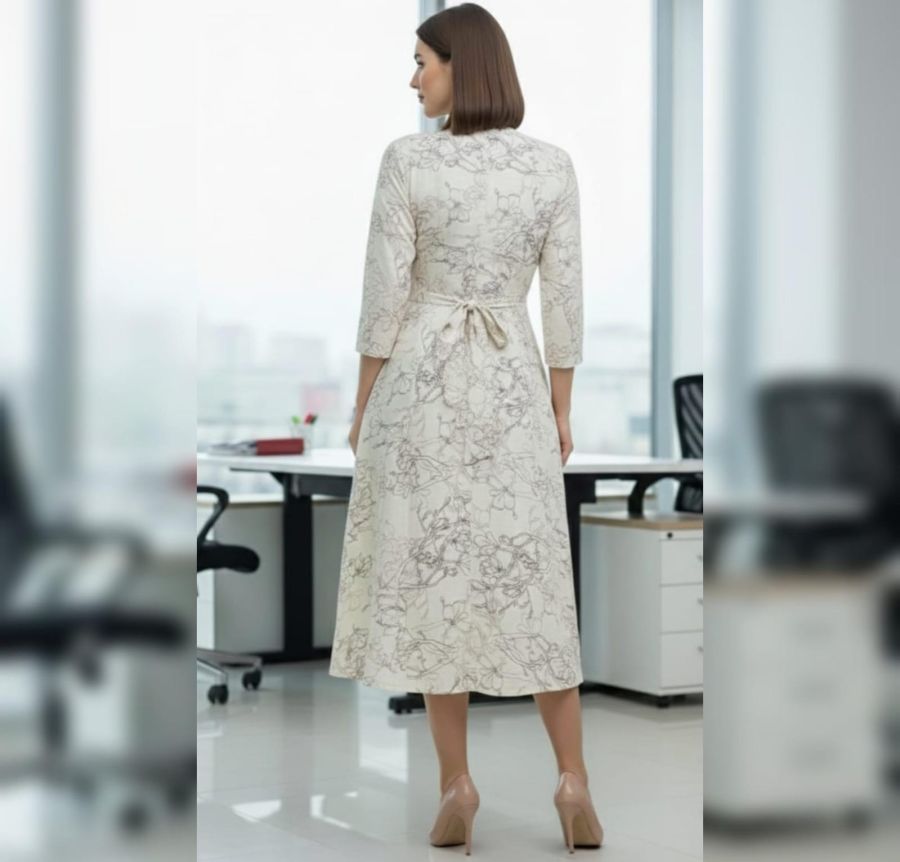 Elevate your professional wardrobe with the Elysian Bloom, a sophisticated A-line midi dress designed for the modern woman. Featuring a subtle ivory base with intricate charcoal floral sketches, this piece balances artistic flair with corporate elegance.