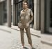 This sophisticated 2-piece set offers a refined, modern aesthetic. The neutral khaki fabric provides a professional backdrop for the bold white spiral motifs, creating a look that is both artistic and perfectly suited for the contemporary workplace.