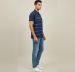 Elevate your casual wardrobe with this Navy Blue Multi-Pattern Polo. Featuring a unique three-tier design, it combines a textured geometric print on the shoulders, a decorative mid-chest border, and sleek horizontal stripes across the body