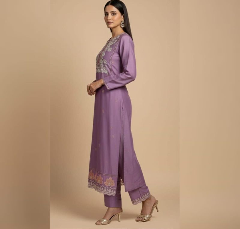 Embrace timeless grace with this stunning 3-piece ethnic suit. Featuring a sophisticated Lavender hue, this set is adorned with intricate floral embroidery along the neckline and hem. It is paired with a sheer, scalloped dupatta and modern straight pants for a look that blends traditional craftsmanship with contemporary tailoring.