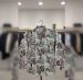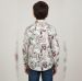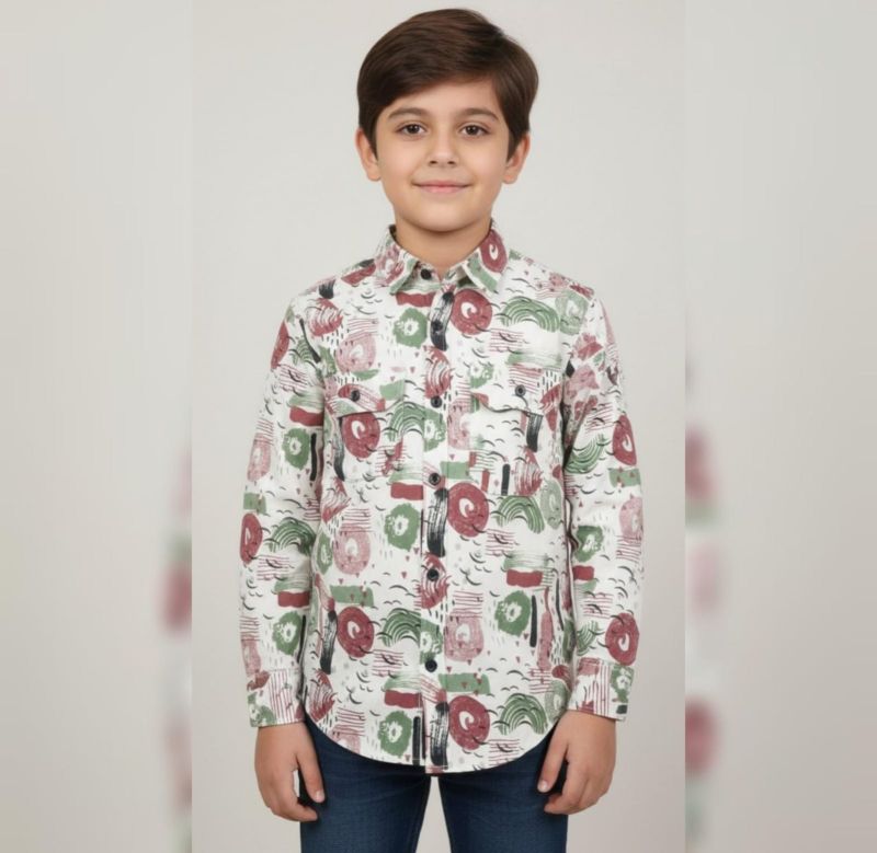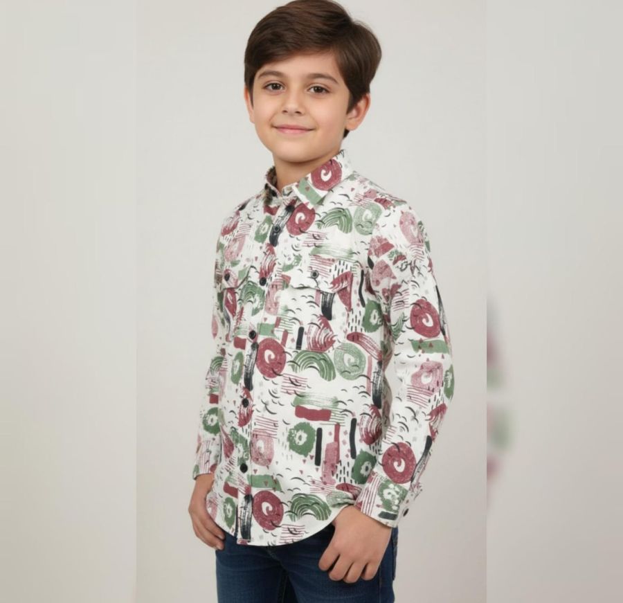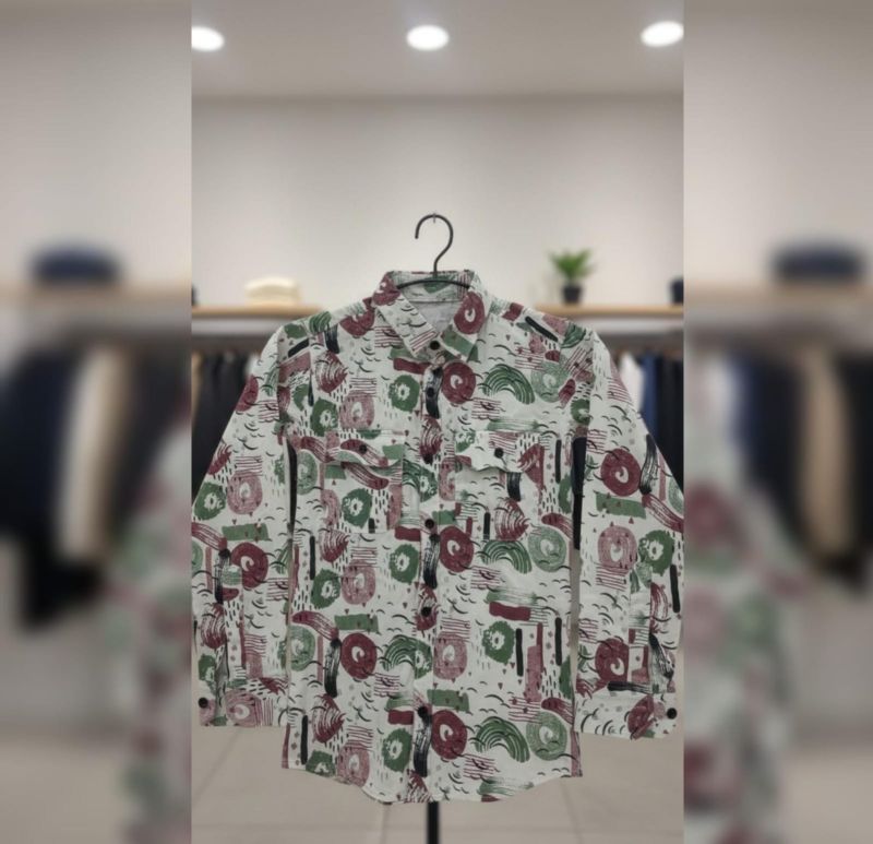That is a bold, artistic piece! The shirt features a multi-color abstract print with a mix of geometric and brushstroke-style elements in shades of burgundy, forest green, and black on a neutral cream background.