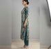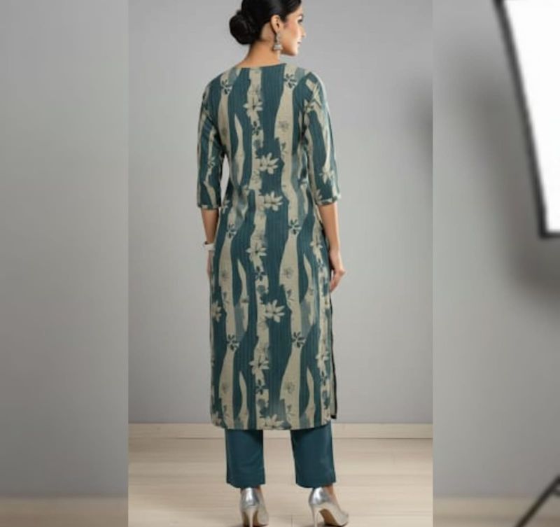 A bold and stylish suit featuring an abstract vertical print in deep teal tones. The set is highlighted by a beautifully patterned dupatta with traditional borders and matching teal straight-fit pants for a balanced, modern look.