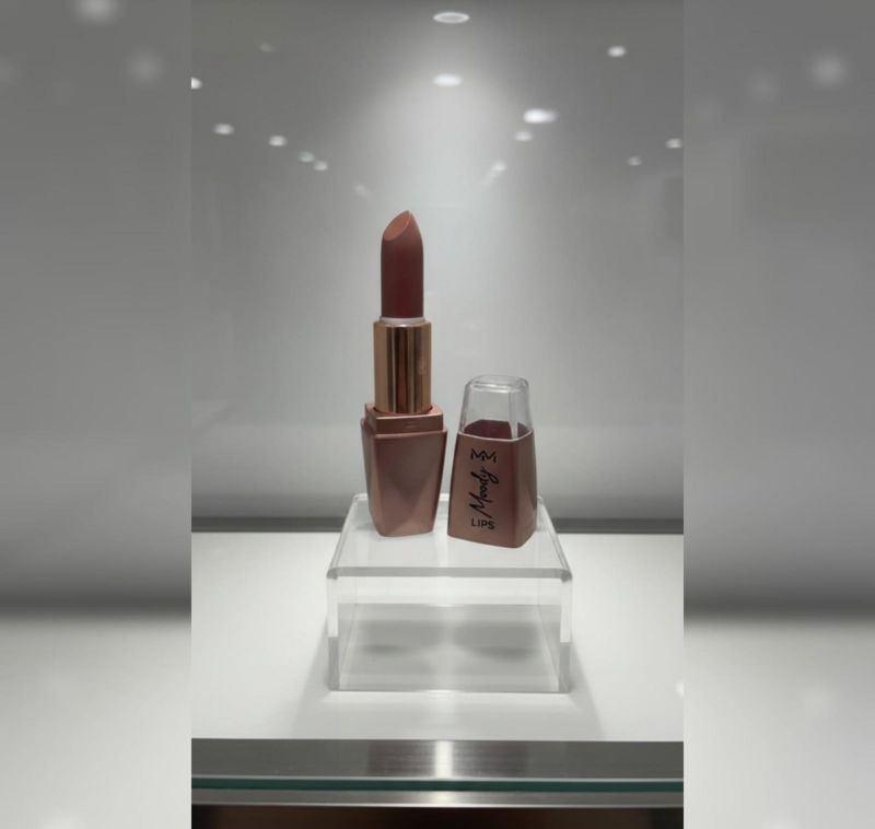 a single lipstick from the Moody Lips collection, presented in a clean, minimalist display setting. It has a sophisticated, modern aesthetic that leans into earthy, neutral tones.