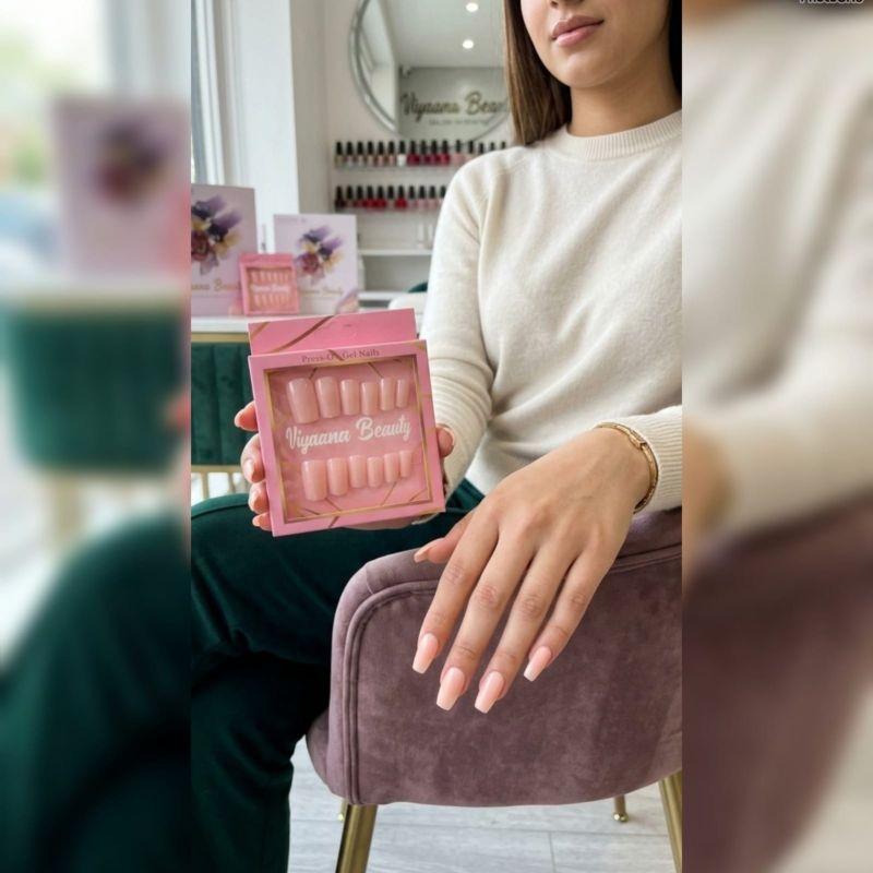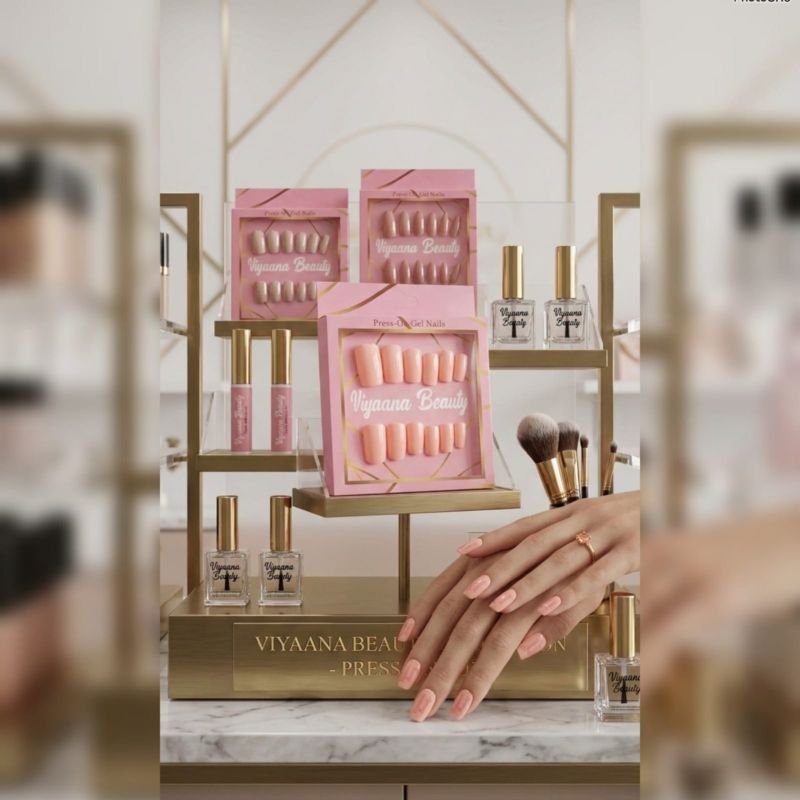 Press-On Gel Nails: These appear to be the star of the show. They come in elegant, neutral shades (nudes and soft pinks) with a high-shine gel finish.