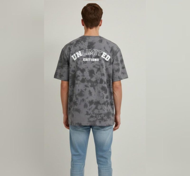 Stay bold with this modern Charcoal Cloud-Wash Graphic T-Shirt. This piece features a distinct grey and black tie-dye pattern, accented by a white "UNLIMITED" varsity-style arch logo on the chest. Perfect for an edgy, streetwear-inspired look.