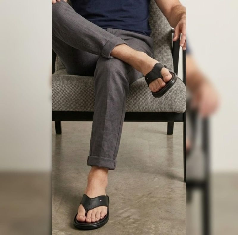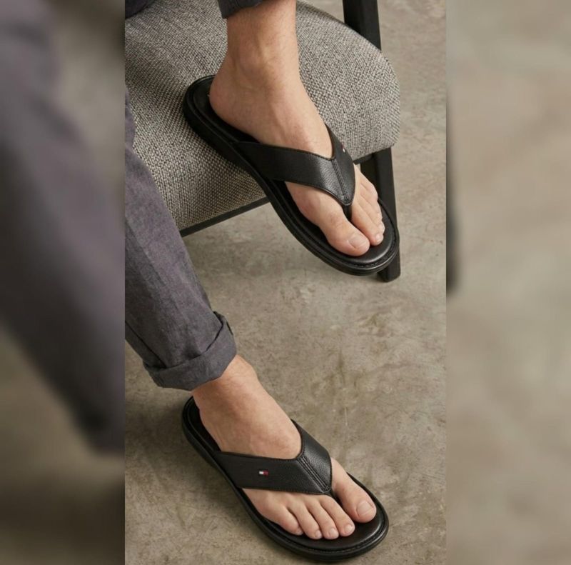 A pair of Tommy Hilfiger Men's Black Leather Flip-Flops (often referred to as "sleepers" or "chappals" in some regions).