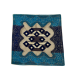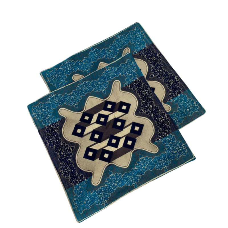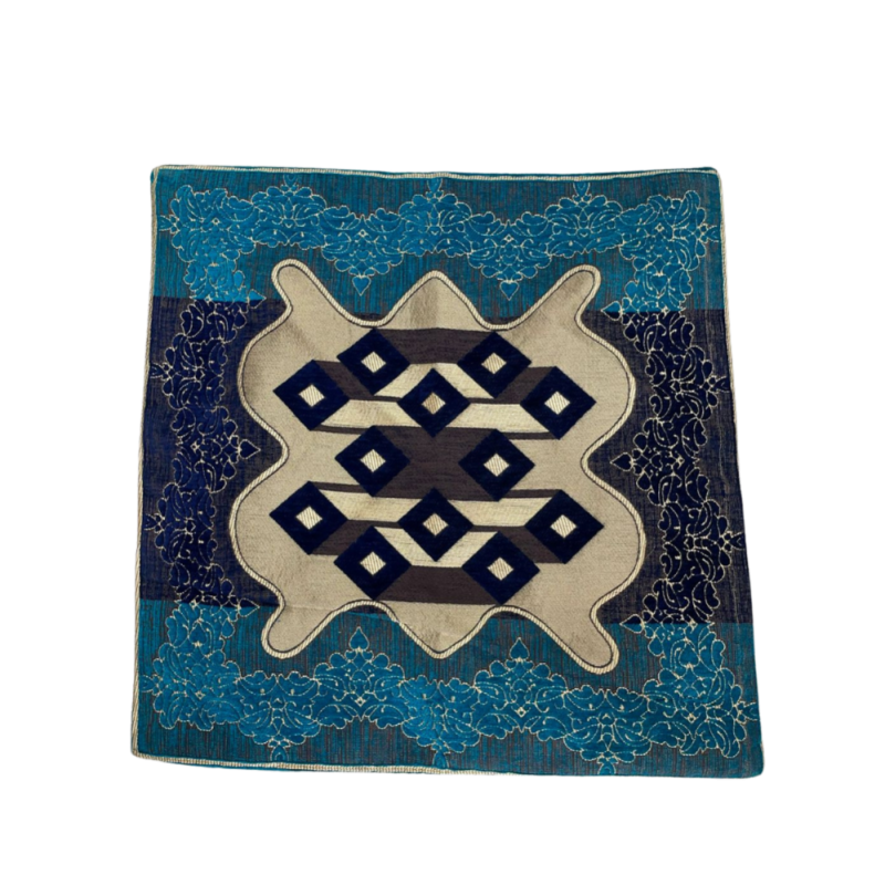 An Elegant cushion cover made of polyester fabric with a cream center, blue border, and intricate dark geometric patterns.